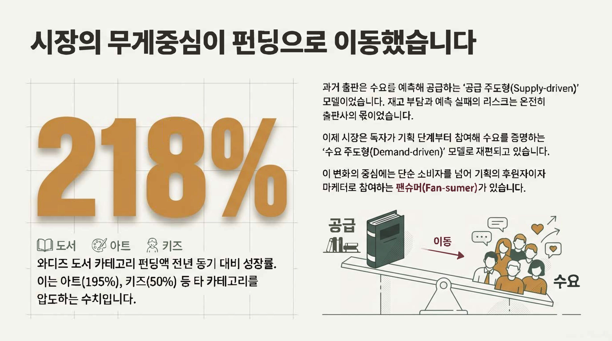 “요즘 책 시장이 어렵다”는 말, 우리에게 너무나 익숙한 진단입니다. 하지만 모두가 힘들다고 말하는 바로 그곳에서, 우리가 전혀 상상하지 못했던 방식으로 새로운 시장이 폭발하고 있습니다. 바로 크라우드 펀딩 시장입니다. 놀랍게도 펀딩 시장의 도서 분야는 전년 대비 무려 218%라는 경이로운 성장률을 기록하며 출판계의 모든 공식을 새로 쓰고 있습니다.
