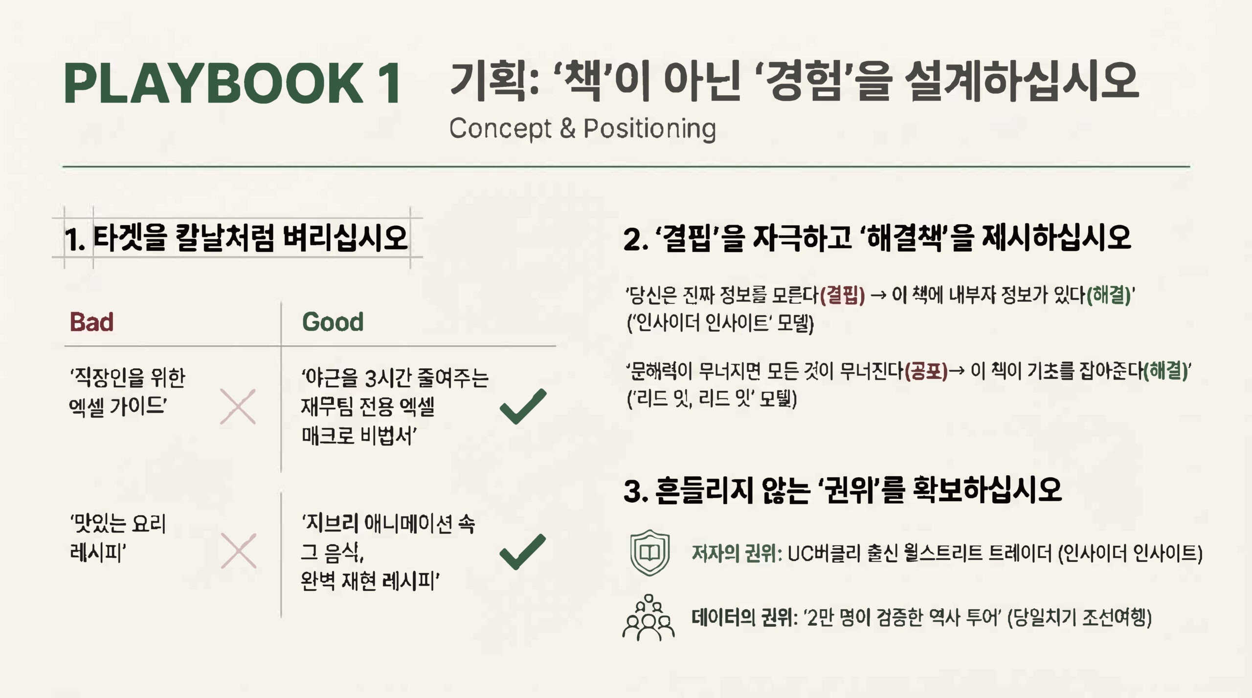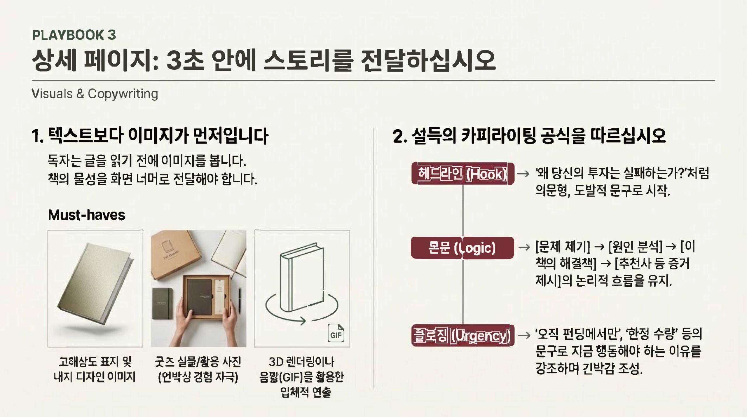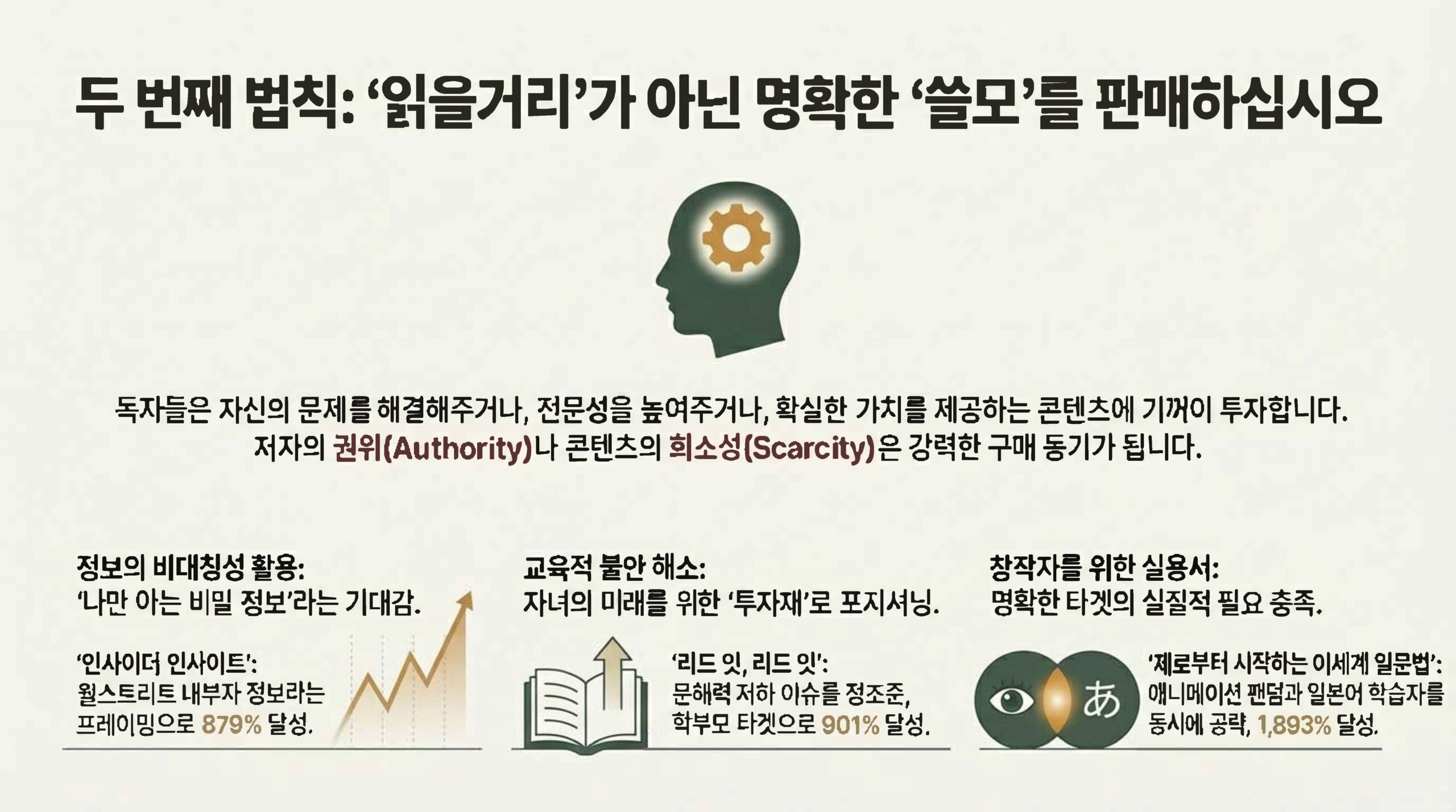 비밀은 간단합니다. 이 프로젝트는 책을 ‘소비재’로 팔지 않았습니다. 대신 독자의 부를 증식시켜 줄 확실한 ‘투자 자산(Investment Asset)’으로 포지셔닝했습니다. 23만 원이라는 높은 가격은 진입 장벽이 아니라, 오히려 “소수만 공유하는 비법서”라는 희소성과 배타성을 부여하는 장치가 되었습니다. 구매자들은 이 책을 소유함으로써 지적 우월감을 느끼고 특별한 그룹에 속했다는 만족감을 얻었습니다. 비쌀수록 더 잘 팔리는 ‘베블런 효과’가 출판 시장에서 완벽하게 작동한 것입니다.