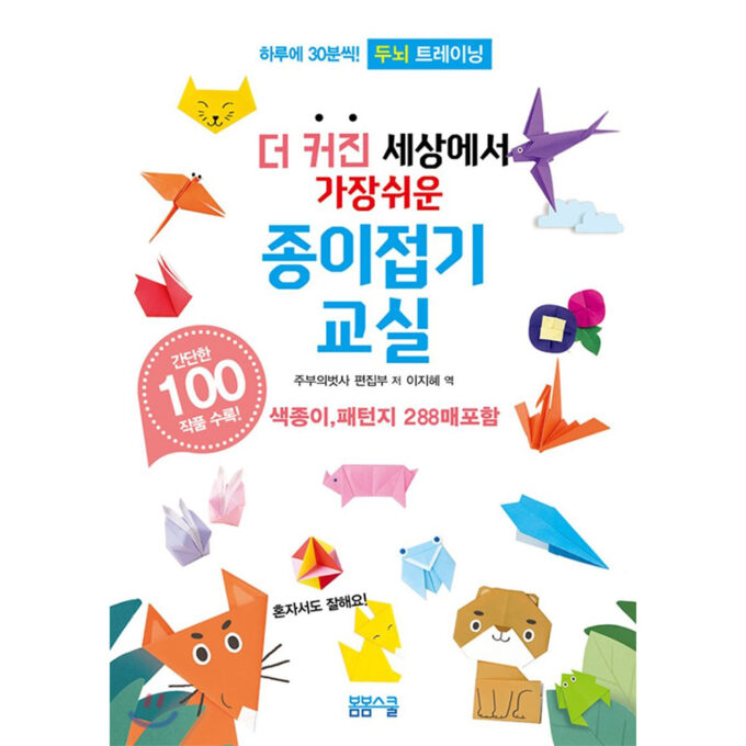 - 가장 인기 높은 종이접기 작품 100개가 수록되어 있을 뿐만 아니라 288페이지의 색종이를 포함하고 있다. 큰 색종이 1, 작은 색종이 2가 한 페이지에 쉽게 뜯을 수 있는 미싱제본으로 제작되어 총 360매의 컬러, 패턴지로 별도 색종이를 구매할 필요가 없다. 페이지 별 패턴지, 색상지를 다양하게 선택해볼 수 있게 한 권으로 모든 것을 제공하며 더 커진 판형으로 종이접기를 하는 중 도서 끝부분이 후르륵 넘어가거나 하지 않게 제본방식을 바꿔 펼침면이 자연스럽게 보이도록 배려하였다.