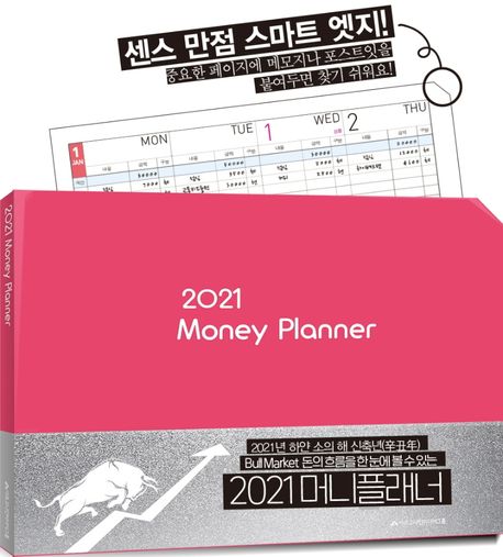 2021년 하얀 소의 해 신축년(辛丑年) 소는 증시에서는 활황인 Bull Market을 의미합니다. 코로나19로 현금 유동성이 많이 풀린 지금 돈을 들고 있으면 가치가 하락하는 상황이 계속 됩니다. 다른 자산으로 빠르게 이동해야 내가 가진 자산의 가치를 높일 수 있는 투자의 시대이기도 합니다. 머니플래너는 돈의 흐름을 알기 위해 매일매일 일상의 기록을 통해 업그레이드되는 라이프스타일을 만들어가는 스마트한 라이프 플래너입니다. 연말연시가 되면 누구나 야심 찬 계획 한 두 개쯤 세우게 되죠. 그 계획을 실현하기 위해서는 목돈이 필요한 경우가 많을 것입니다. 하지만 돈을 모으는 습관은 그리 쉽게 생기지 않습니다. - 저자 소개