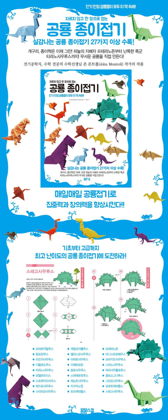 이제 종이학, 종이배, 개구리, 나팔꽃 등 어느 책에서나 흔히 볼 수 있는 똑같은 종이접기는 그만 하자. 이왕 만드는 거 수준을 높여 좀 더 정교한 종이접기를 해보자. 그것도 사라진 지구의 지배자 공룡이라면 더욱 신나고 멋지지 않을까.