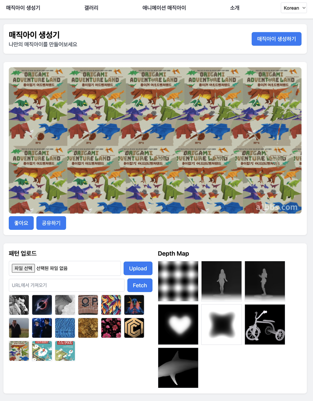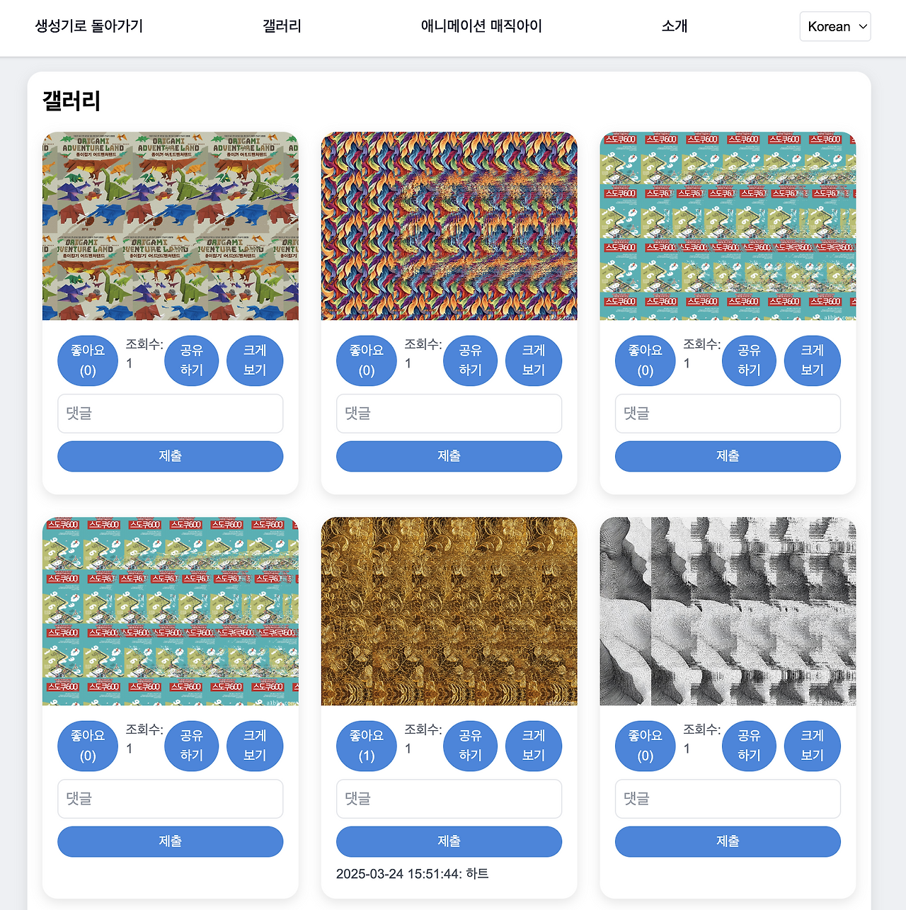 실시간으로 매직아이를 자동으로 생성할 수 있는 프로그램을 일단 마쳤습니다. 일단 인터페이스를 달기 귀찮아 했는데 프론트쪽을 대충 해놓고 돌아가기는 합니다.