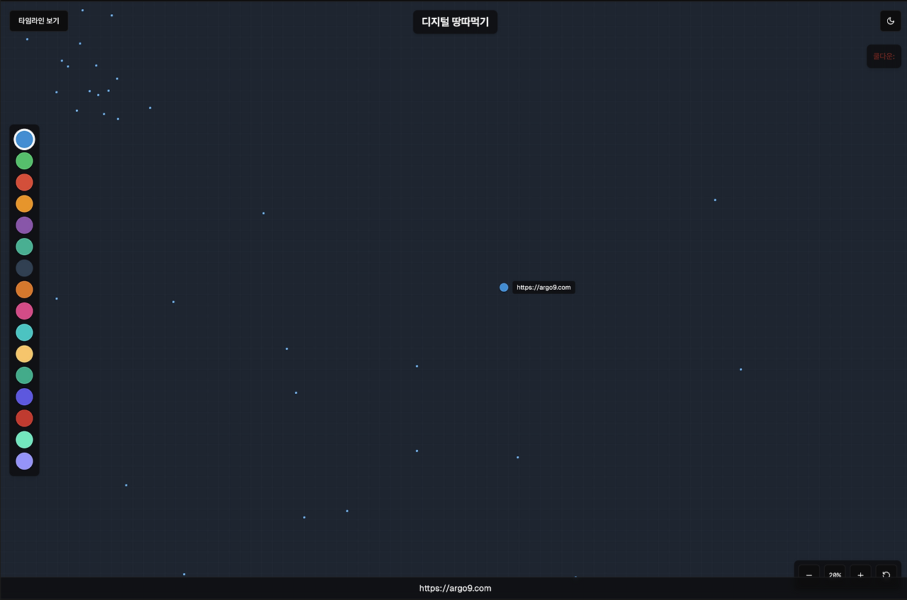 디지털 땅따먹기 도전해 보세요...라고 해놓고 서비스를 안 열고 있는... AI가 방해함... 우주에 점을 찍으면 그걸 다 기록하고 있다가 영상을 재생해 줘요 50개 찍으면 잠깐 쉬게 되고 친구에게 나머지 점을 찍어달라고 해야 땅따먹기가 이뤄집니다.