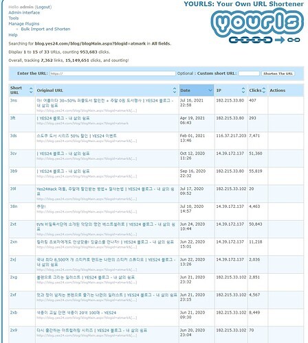 33개의  URL 중 1  에서 15 를 표시 하고 953,683 클릭을 계산합니다.