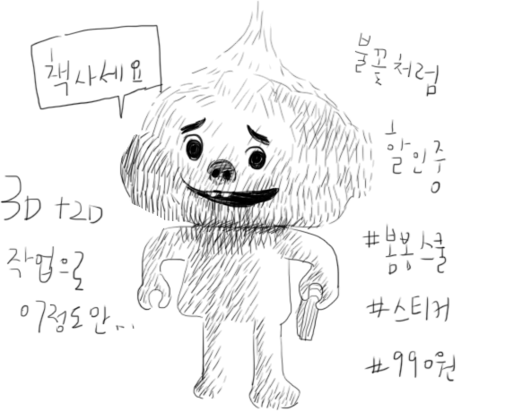 블랜더를 하다가 안하다가 다시 잠깐 3D 모델링을 해서 캐릭터를 만들어 내려고 하는 중에 굉장히 잘 만들 필요도 없고 일단 대충대충 모양만 맞추고 캐릭터를 뽑아낼 준비를 하고 있습니다. 펜터치 느낌으로 제작할 생각이고 그레이스펜슬로 터치를 하고 싶었지만 아직 능숙하지 않아서 포토샵으로 리터치