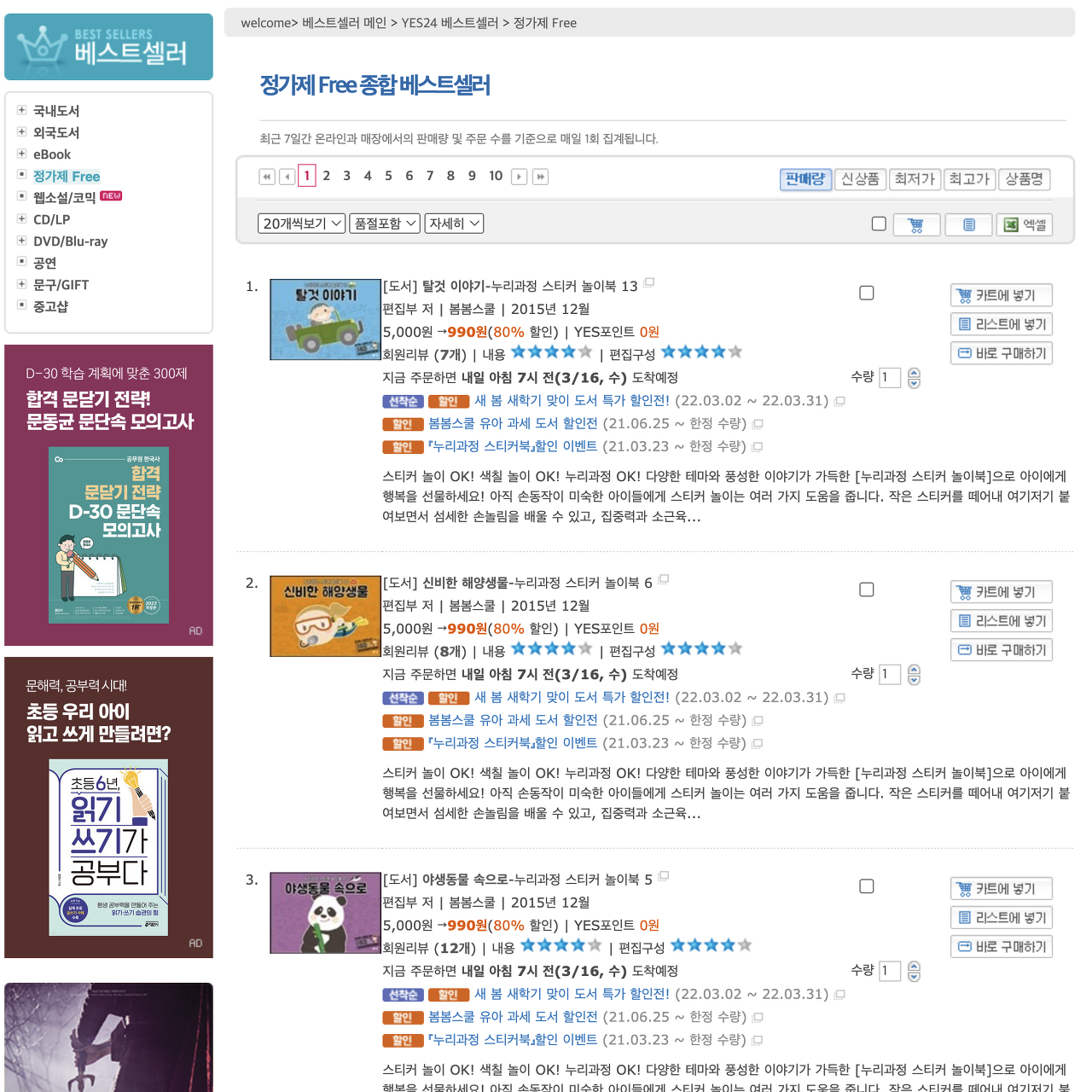 Yes24 베스트셀러 1-20위에 16권을 올리다.