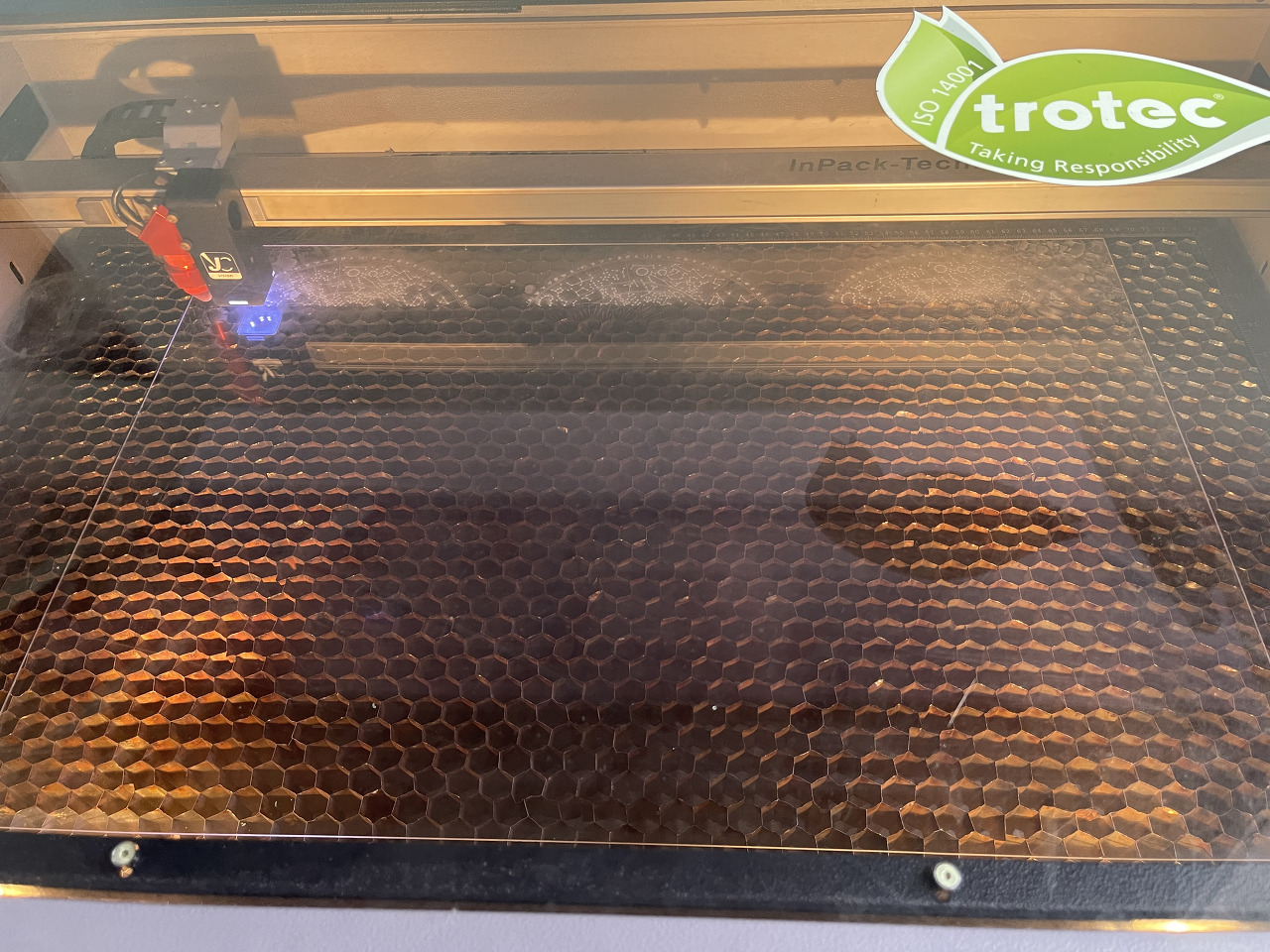 큰 사이즈로 최대 6개가 들어갈 것으로 생각했으나 하단 조명 연결되는 부분을 생각못해서 5개가 최대로 들어갑니다. 그리고 1회 인그레이빙과 커팅을 다 해서 37분정도 걸립니다. 1개 찍을때 23분 걸린 것에 비해 훨씬 많은 작업물이 출력되어 생산성향상이 있습니다.