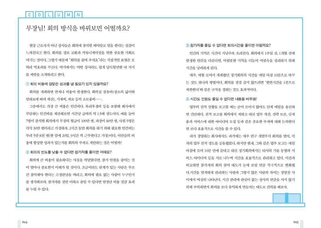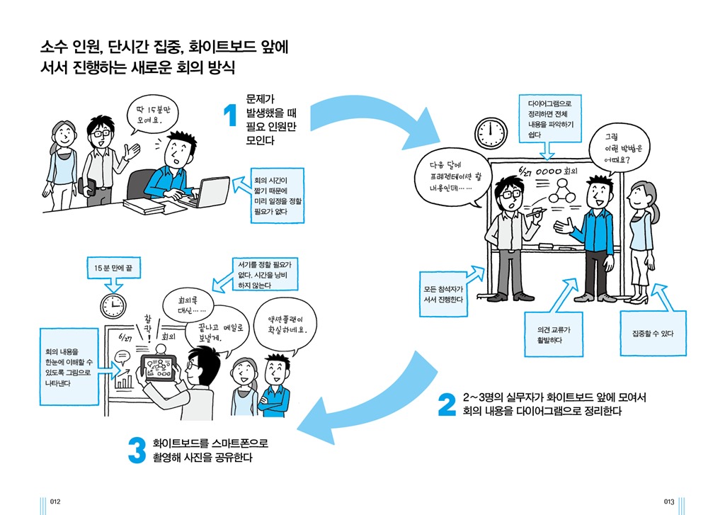 ------------------------------------------------------------------------ 1. 책 소개 회의 스타일과 정리 방법을 바꾸면 경쟁력이 달라진다! 생산성과 독창성을 모두 갖춘 새로운 스타일의 회의를 만난다! 지난날 고도성장을 이룬 기업가들은 시대의 변화와 의사 결정 속도를 중요시했기 때문에 경쟁력을 구축하는 데 성공했다. 발 빠르게 변화하는 현대 사회에서 가치와 성과를 창출하려면 개인은 물론 기업 역시 신속한 의사 결정이 필수적이다. 1개월 혹은 1주일, 아니 한순간만 판단이 늦어도 큰 비즈니스 찬스를 놓칠 위험이 있기 때문이다. 지금은 사소한 실수나 재검토를 감안하더라도 빠른 결정이 더 중요한 시대라 할 수 있다. 이를 위해선 무엇보다 기존의 회의 방식을 뒤집어야 한다. 지금의 비생산적인 회의는 시간과 비용을 잡아먹는 ‘괴물’과도 같다. 실제로 많은 비즈니스맨들이 회의를 시간 낭비에 불과한, 지루하고 쓸모없는 업무로 취급하고 있는 게 현실이다. 특히 기업의 규모가 크면 클수록 회의시간도 길어지는 경향이 있다. 대기업이라면 더더욱 ‘회의의 생산성’이 회사의 실적을 좌우하는 데도 말이다. 소수 인원이 단시간 집중해 서서 진행하는 ‘3S 회의’ 저자는 기존 회의의 대안으로 소수 인원(Small number)이 짧은 시간(Short time)에 화이트보드 앞에 서서 진행(Standing)하는 회의인 ‘3S 회의’를 권장한다. 이 회의는 문제가 발생했을 때 최소한의 필요 인원만 모인다는 특징을 갖고 있다. 또한 2~3명의 실무자가 화이트보드 앞에 모여서 회의 내용을 다이어그램으로 정리하고 그 내용을 스마트폰으로 촬영해 공유하는 식이다. 회의 시간이 짧기 때문에 미리 일정을 정할 필요가 없으며 화이트보드 앞에 서서 진행하기 때문에 의견 교류가 활발하고 집중할 수 있다는 장점이 있다. 무엇보다 화이트보드에 그림, 즉 다이어그램으로 정리해 전체 내용을 쉽게 파악할 수 있으며 스마트폰으로 촬영해 공유하기 때문에 시간을 아낄 수도 있다. 이 모든 것이 15분 내에 이루어지니 기존 회의에 진절머리 났던 비즈니스맨이라면 쌍수를 들고 환영할 일 아닌가? 이러한 생각정리 회의에서 중요한 핵심은 정리 방법으로서의 그림(다이어그램)이며 이 책에서는 회의 기술과 더불어 여러 타입의 다이어그램을 소개하고 활용법도 함께 담고 있다. 제한된 시간과 정보 안에서 판단을 내려야 하는 우리에게 이런 식의 기술과 소수인원 회의는 매우 강력한 도구가 되어준다. 이 책의 내용을 실천하면 회의의 생산성이 향상되는 것은 물론이고 기업이 원하는 유능한 인재로 바뀔 수 있다. 결과적으로 회사와 당신 모두 성장하는 것이다. 준비되었는가? 지금부터 지루한 회의실을 떠나 혁신적인 회의를 시작해보자. 2. 본문 보기   3. 목차 머리말 회의는 시간 낭비에 불과한 것일까? 도해사고을 응용한 새로운 회의 방식 CHAPTER 1 문제 편-지금까지의 회의 방식을 바꾼다 회의는 시간 낭비라는 사람이 무려 45% ! 우리 회사의 회의는 과연 몇 점? 무의미한 회의의 특징① 불확실 목적과 목표가 불확실하면 시간 낭비 무의미한 회의의 특징② 혼란 참가자가 너무 많은 회의는 이야기가 정리되지 않는다 무의미한 회의의 특징③ 오해 말은 오해와 차질을 낳는다 무의미한 회의의 특징④ 산만 안건이 많을수록 회의는 산만하다 무의미한 회의의 특징⑤ 집중력 한계 한계 회의가 길어지면 사고는 정지한다 무의미한 회의의 특징⑤ 플랜 부재 액션플랜이 없으면 행동도 없다 회의가 달라지면 회사도 변화한다 COLUMN 부장님! 회의 방식을 바꿔보면 어떨까요? CHAPTER 2 해답 편- 지적 생산성을 향상시키는 3S 회의 3S 회의의 시작① 지적 생산성을 향상시키는 방법 3S 회의의 시작② 신속한 의사 결정과 이노베이션으로 경쟁에서 승리한다 3S 회의의 진행 방법① 집중하면 15분 만에 답이 보인다 3S 회의의 진행 방법② 화이트보드에 다이어그램을 그려 정리한다 3S 회의의 진행 방법③ 화이트보드와 스마트폰을 준비하라 3S 회의의 특징① 다이어그램으로 정리하면 키워드가 보인다 3S 회의의 특징② 다이어그램을 활용해 모순과 오해를 줄인다 3S 회의의 특징③ 회의록을 쓰는 대신 사진을 찍는다 3S 회의의 특징④ 프로젝터 영상 위에 다이어그램을 그린다 3S 회의의 특징⑤ 화이트보드 앞에 서서 회의를 한다 COLUMN 회의의 질을 보다 더 향상시키려면? 사무실의 벽을 화이트보드로 바꿔라 CHAPTER 3 다이어그램 응용 편①-문제를 분해하면 해결의 실마리가 보인다 이론① 문제를 발견한 후 해결 방안을 탐색한다 이론② 문제를 해결하려면 분해, 분석하라 이론③ 다이어그램의 기본 패턴을 알아보자 다이어그램의 종류① 트리형 패턴으로 분해한다 다이어그램의 종류② 매트릭스형으로 분해한다 다이어그램의 종류③ 프로세스로 분해한다 다이어그램의 종류④ 그룹으로 분해한다 다이어그램의 종류⑤ 새틀라이트형으로 분해한다 다이어그램의 종류⑥ 통계상의 숫자로 분해한다 다이어그램의 종류⑦ 프레임워크로 분해한다 COLUMN 논리적 사고의 기본! MECE한 분류를 기억하라 CHAPTER 4 다이어그램 응용 편②-아이디어를 찾는 방법과 정리하는 기술 발상의 기본① 아