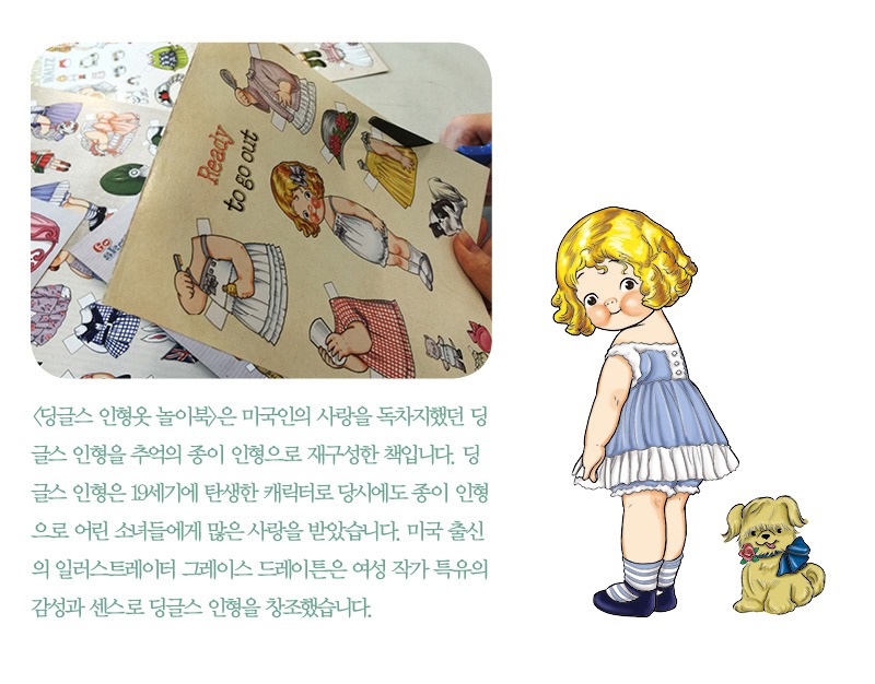 은 미국인의 사랑을 독차지했던 딩글스 인형을 추억의 종이 인형으로 재구성한 책입니다. 딩글스 인형은 19세기에 탄생한 캐릭터로 당시에도 종이 인형으로 어린 소녀들에게 많은 사랑을 받았습니다. 미국 출신의 일러스트레이터 그레이스 드레이튼은 여성 작가 특유의 감성과 센스로 딩글스 인형을 창조했습니다.