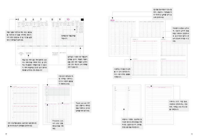 는 요즘 생활 패턴에 딱 맞게 고안하고 디자인한 가계부입니다. 쓰기 편한 구성은 기본, 매일 한 장씩 펜으로 입출금을 기록하고 정리하다 보면 돈의 흐름을 한 번에 알 수 있도록 배열했습니다. 소비 패턴을 파악하고 돈이 어디로 빠져나가는지를 체크하는 것은 물론이거니와 주부에게는 꼭 필요한 핵심 정보도 빠짐없이 담았습니다.