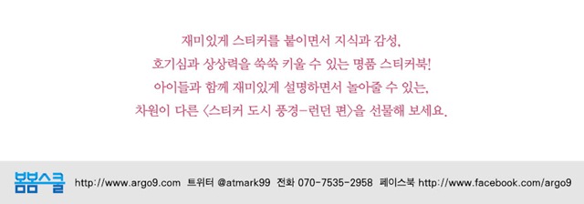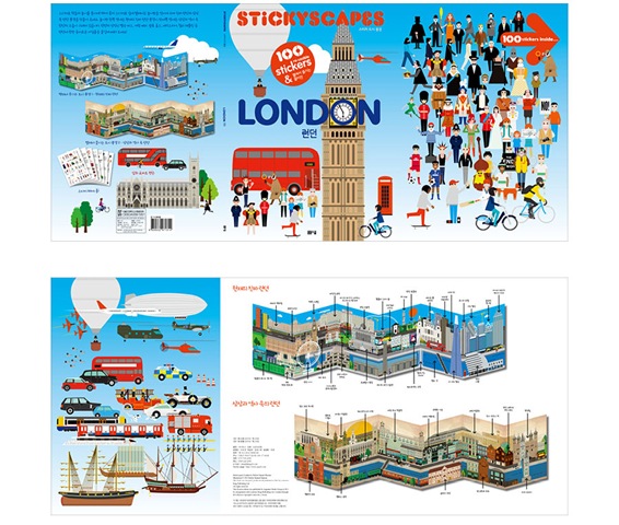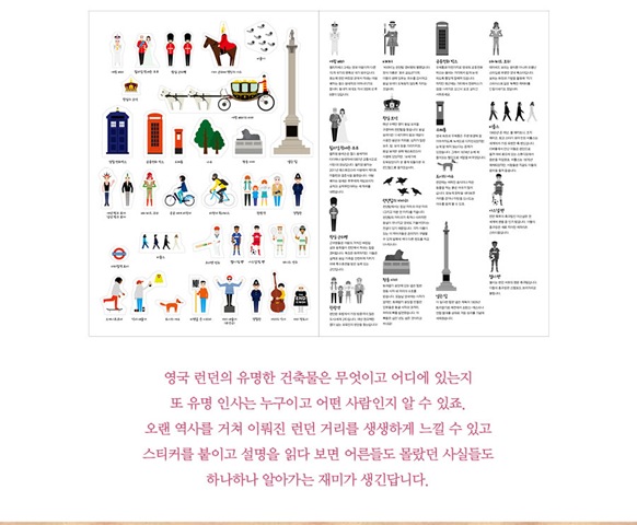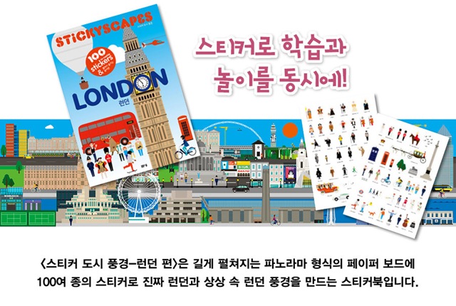은 길게 펼쳐지는 파노라마 형식의 페이퍼 보드에 100여 종의 스티커로 진짜 런던과 상상 속 런던 풍경을 만드는 스티커북입니다. 영국 런던의 유명한 건축물은 무엇이고 어디에 있는지 또 유명 인사는 누구이고 어떤 사람인지 알 수 있죠.