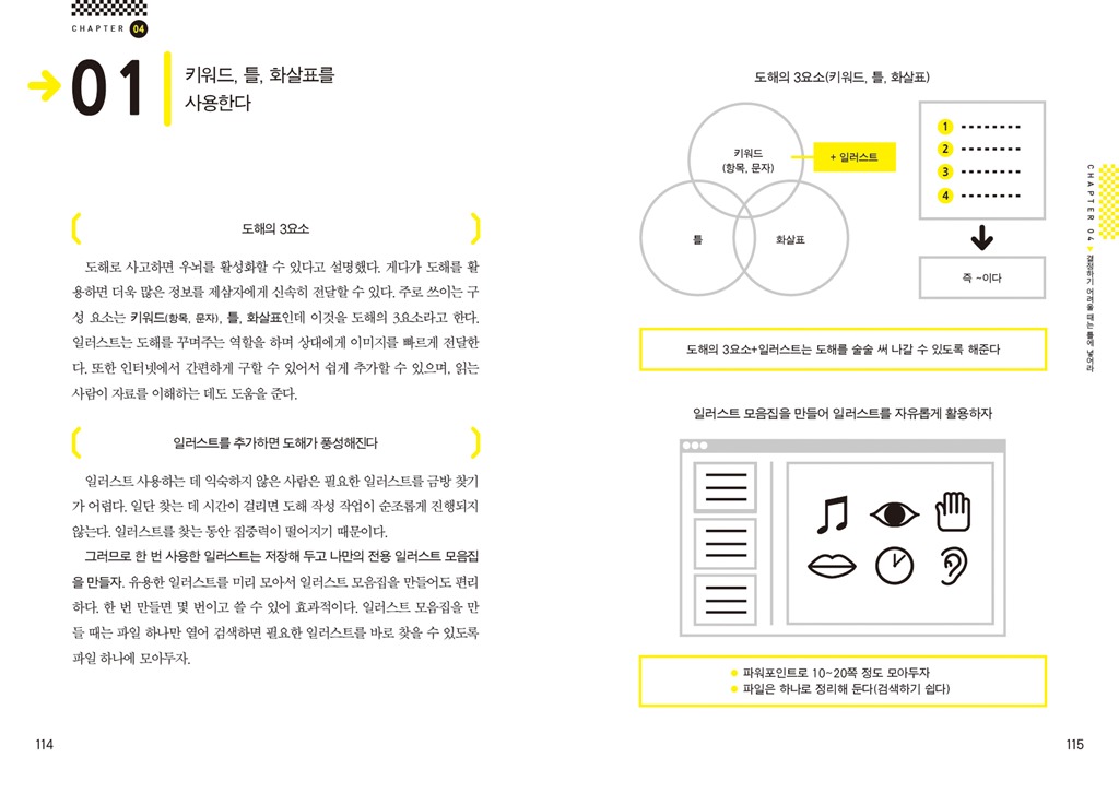 사람의 머릿속에는 1분에도 수많은 생각들이 오고간다. 생각의 흐름을 정리하지 않으면 일할 때도 집중력을 발휘하기 힘들고 30분이면 끝낼 수 있는 일을 두 시간, 세 시간이 지나도록 처리하지 못하고 붙잡고 있게 된다. 또한 여러 가지 일 중에 어떤 일을 먼저 시작해야 할지 몰라 전전긍긍하며 시간을 허비하기도 한다. 평소 이처럼 어지러운 머릿속 때문에 고민하고 있는 사람이라면 이제부터 생각을 정리하는 기술에 주목해 보자. 에서는 복잡한 생각들을 질서정연하게 갈무리해서 업무 효율성을 극대화하는 방법을 제시한다. 특히 도해를 활용한 아이디어 발산과 수렴의 방법은 단순히 생각을 정리하는 데 그치는 것이 아니라 기존의 생각을 더 확장시켜 우수한 생각을 이끌어내는 데 도움을 준다.