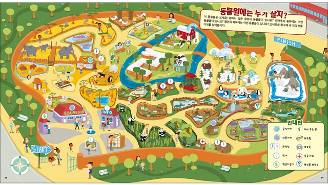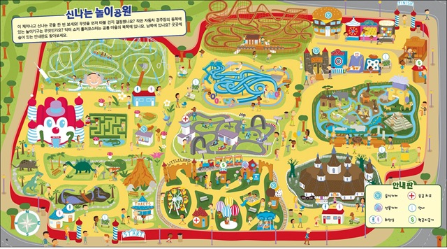 은 취학 전 아이에게 맞춰 미로를 단순화하고 길만 크게 만든 책이 아닙니다. 이 책은 크게 놀이공원과 동물원으로 테마를 나누어 미로와 함께 방향 감각을 키울 수 있는, 동서남북 문제를 배치했습니다. 모든 공간에서 아이는 사람 혹은 동물, 물건이 동서남북, 어느 방향에 있는지를 풀어야 합니다. 이 퀴즈는 나침반과 안내판을 잘 활용하는 것은 물론 집중력을 가지고 페이지 전체를 살펴야만 답을 구할 수 있습니다.