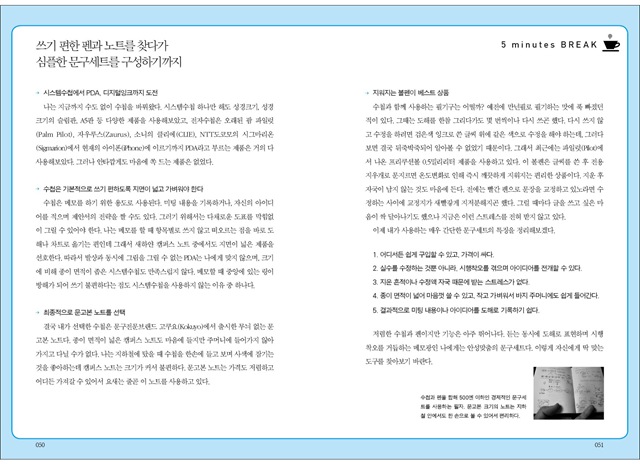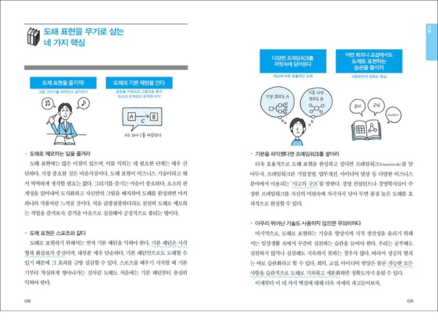 도해 표현을 무기로 삼는 네 가지 핵심 도해로 메모하는 일을 즐기자 도해의 기본패턴을 알아두자 변형과 패턴을 알고 생산성을 올리자 언제나 도해로 메모하는 습관을 들이자 항목별 메모의 여섯 가지 문제점과 도해메모의 여섯 가지 효과 쓰기 편한 펜과 노트를 찾다가 심플한 문구세트를 구성하기까지