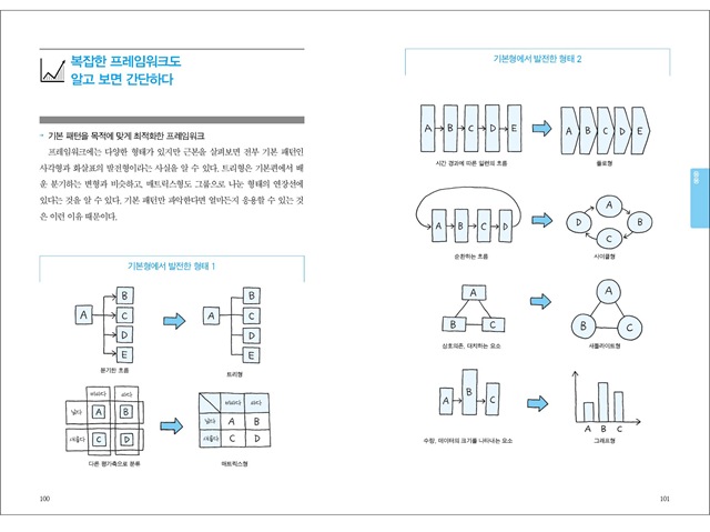 파워포인트나 마인드맵, 다이어그램, 피시본 등의 비즈니스 툴의 원리는 정보를 도식화하고 그것을 간단명료하게 표시하는 기능에 있다. 하지만 이런 툴에 맞춰서 생각을 정리하는 프레임워크 사고방식은 효율적이긴 하지만 자유로운 생각을 발현하기는 힘들다.