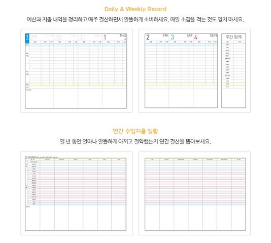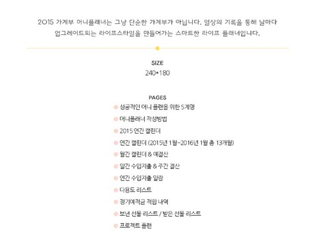 2015 가계부 머니플래너는 그냥 단순한 가계부가 아닙니다. 일상의 기록을 통해 날마다 업그레이드되는 라이프스타일을 만들어가는 스마트한 라이프 플래너입니다.