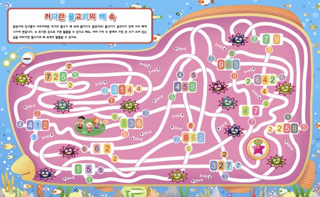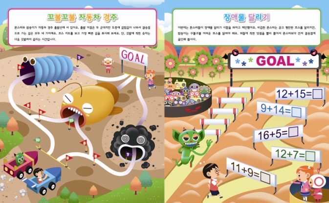 에는 수학을 싫어하는 밤송이가 친구 예린이와 함께 수학나라에 갇히게 되면서 이야기가 시작됩니다. 숫자 몬스터들이 내는 여러 가지 문제들을 풀면서 수학나라를 탈출해야만 하죠. 주인공들의 흥미진진한 이야기에 빠져들어 문제를 풀면 지루할 틈이 없습니다. 단순히 공식이나 수학식을 나열하는 것이 아니라 퍼즐과 미로로 구성되어 있기 때문에 거부감 없이 수학을 접할 수 있습니다. 특히 미로는 집중력을 키우기에도 좋답니다. 아기자기하고 귀여운 그림체는 아이들의 눈을 사로잡기에 충분하죠.