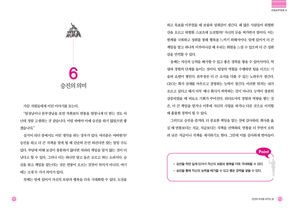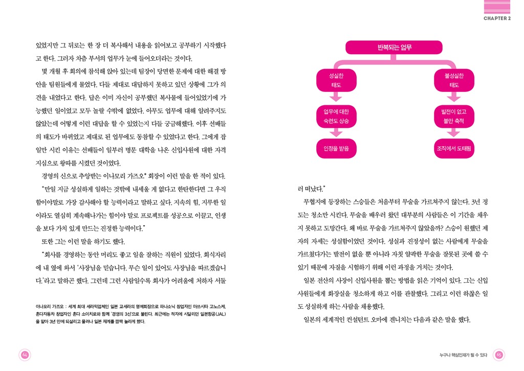 이 책에서는 열정, 끈기, 성실, 긍정, 배움이라는 다섯 가지 자세와 기록과 생각 정리, 보고, 프레젠테이션 등의 기본 역량을 강조하고 있다.