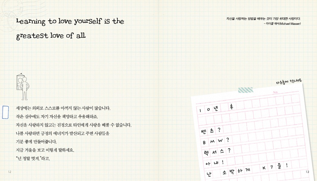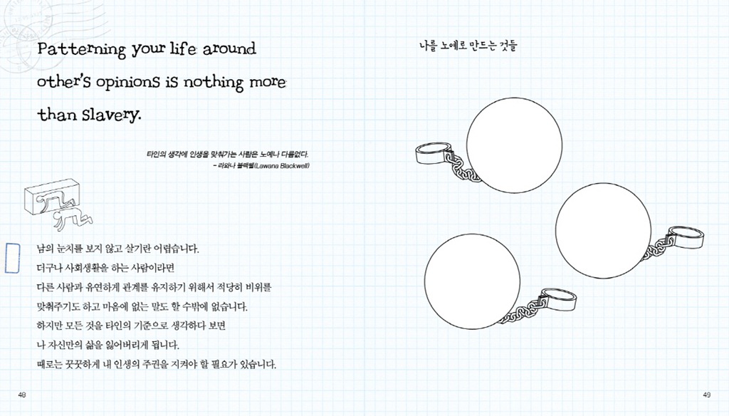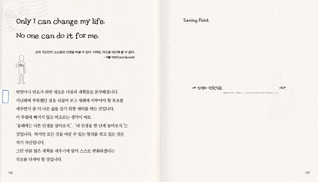 하지만 이 책은 여기에서 끝나지 않습니다. 에는 독자가 직접 표기할 수 있는 공간이 곳곳에 배치되어 있습니다. 자신만의 명언을 넣을 수도, 꿈과 행복의 메시지를 펜으로 적어 책을 완성할 수 있게 만들어졌습니다.