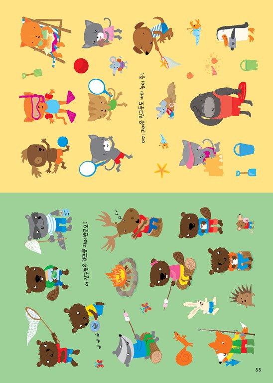 이뿐만이 아니다. 본문에 마련된 바닷가와 공원, 해저, 공항, 도시, 정원, 시골 마을, 숲속, 편의점 등의 배경을 이용, 자유롭게 스티커로 꾸미면서 개성과 창의력, 공간 감각을 기를 수 있다.