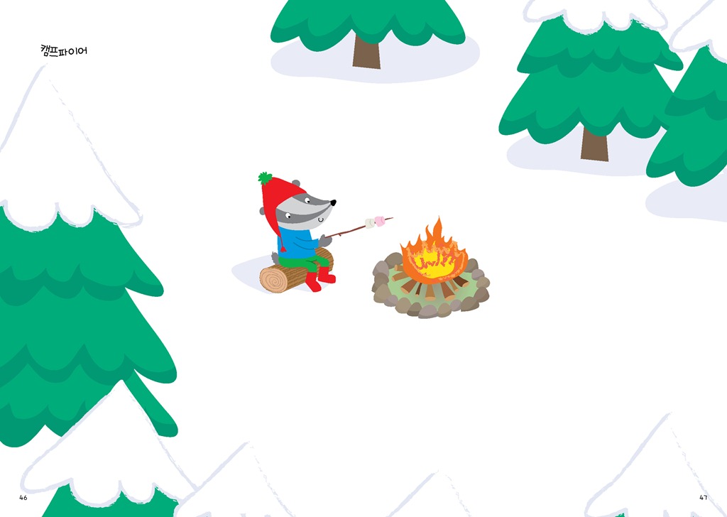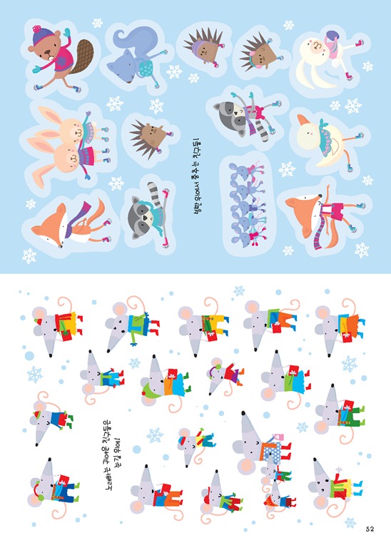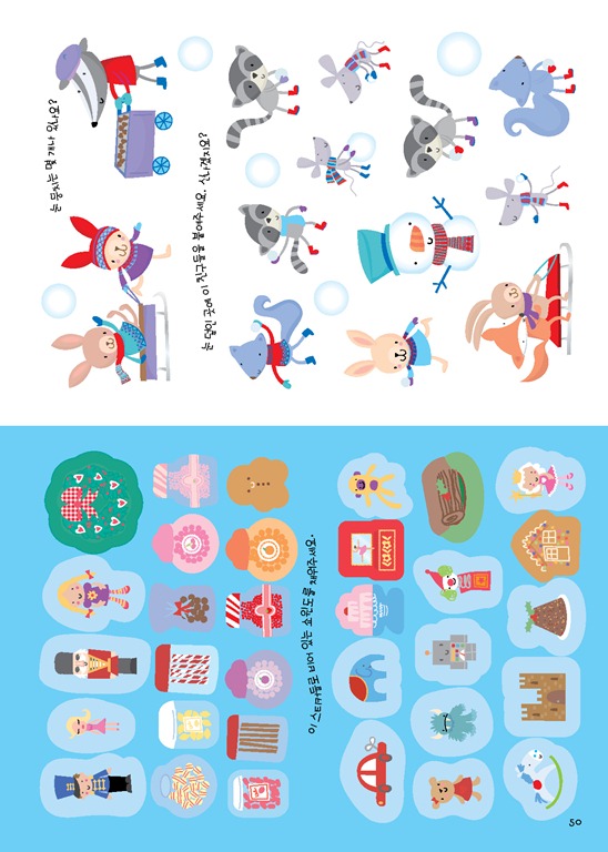 이뿐만이 아니다. 본문에 마련된 눈 덮인 언덕, 크리스마스트리, 겨울나무, 산타의 작업장, 크리스마스 벽난로, 눈 내린 마을, 캠프파이어 등의 배경을 이용, 자유롭게 스티커로 꾸미면서 개성과 창의력, 공간 감각을 기를 수 있다.