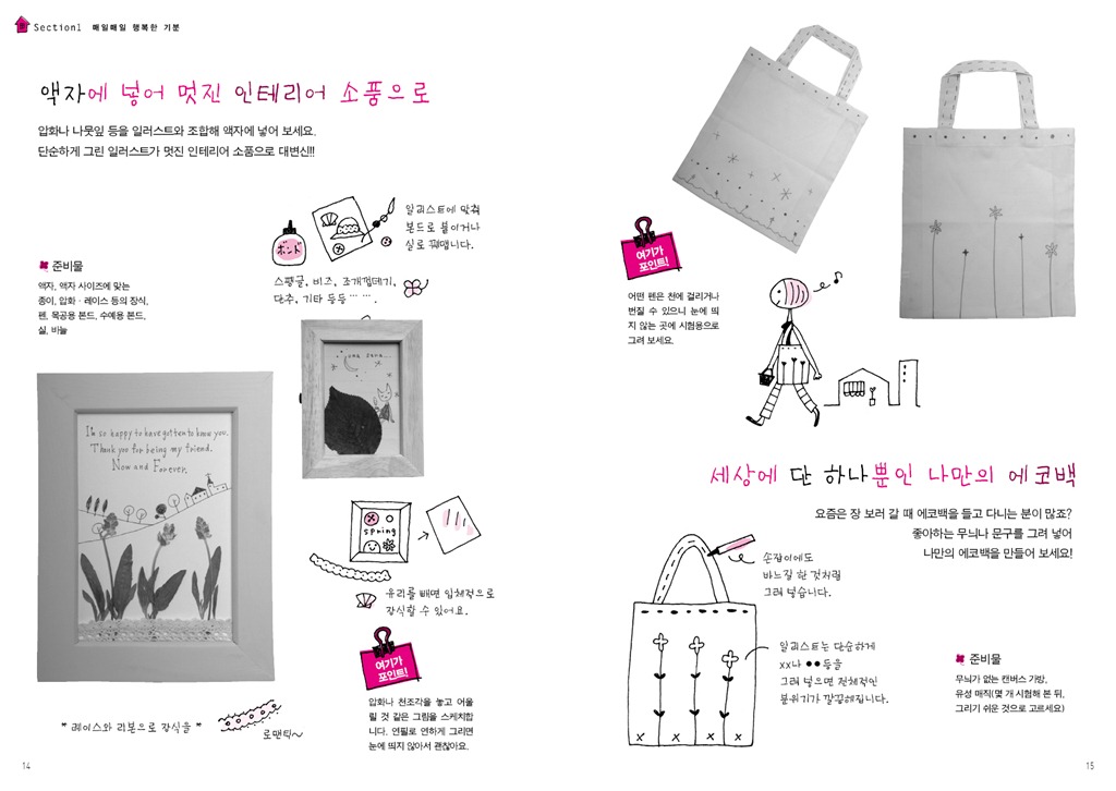 ‘1장 다양한 일러스트로 일상에 활기를!’ 코너에서는 일상에 활력을 불어넣어주는 생활용품 그림그리기부터 마음을 담은 선물에 그리는 일러스트, 다이어리나 앨범을 꾸미는 일러스트 기법이 담겨있다. ‘2장 아기자기 일러스트를 그려 볼까요?’에는 캐릭터를 만들고 표현하는 요령과 심플 일러스트, 생활 속 일러스트, 계절 일러스트 등 다양한 분야의 표현법을 배운다. ‘3장 모두가 궁금해 하는 질문’에는 프로 일러스트레이터로 활동하고 있는 저자의 노하우로 가득하다. 특히 간결한 선을 사용한 일러스트 기법을 소개하기 때문에 접근성이 쉽다는 것이 장점이다. 게다가 그림을 그리다보면 자연스레 갖게 되는 의문점인 적당한 두께의 팬 고르기, 소품을 잘 그리는 요령, 전문가의 그림처럼 보이는 비법 등은 일러스트 초심자가 빨리 그림을 익혀나가는데 큰 도움이 될 것이다.