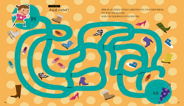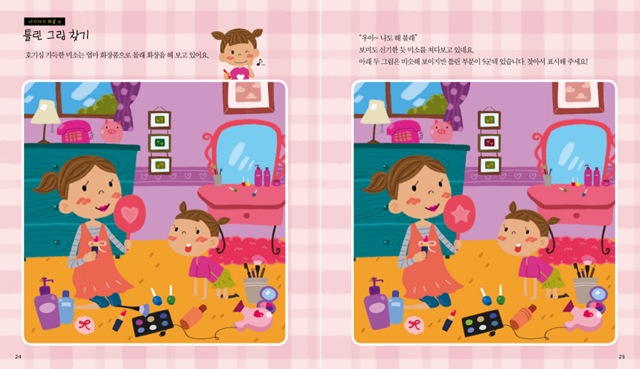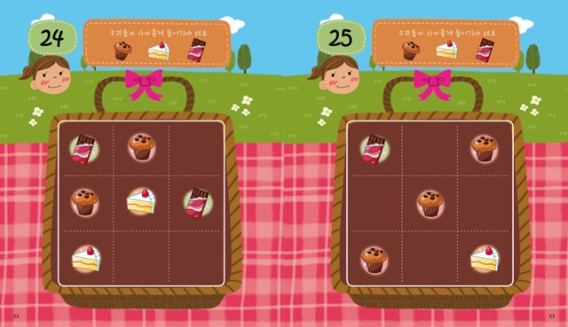 제 목: 매일매일 두뇌 트레이닝 <아기자기 스티커 스도쿠> 1권 저 자: 손호성 그 림: 김혜라 면 수: 96 판 형: 182*210 출판사: 아르고나인 발행일: 2011년 1월 15일 정 가: 8,800원 ISBN : 978-89-93497-61-8 13740 1. 책 소개 아기자기 귀여운 스티커로 두뇌 개발하기! <아기자기 스티커 스도쿠>는 예쁜 스티커를 붙이면서 푸는 퍼즐북입니다. 수학자 레온하르트 오일러의 매직 스퀘어를 응용해 만들어진 퍼즐은 어린이들의 수학적, 논리적 사고를 키워줍니다. 또한 미로, 틀린 그림찾기 및 논리 퍼즐도 함께 수록되어 아이들이 싫증내지 않고 퍼즐을 풀어갈 수 있도록 구성되었습니다. 퍼즐들은 모두 주의 깊게 살펴보기만 하면 힌트를 발견하며 풀어나갈 수 있어 성취감을 얻을 수 있습니다. 퍼즐은 구두, 화장품, 쿠키 등 예쁜 이미지를 사용해 만들어져 아이들의 흥미를 불러일으킵니다. 숫자 대신 그림을 넣어 푸는 퍼즐은 아이들의 두뇌를 다양한 방식으로 자극합니다. <엄마의 화장대를 정리해요>, <내 장화 어디 갔어?>, <화창한 하늘, 달콤한 피크닉>, <산타 할아버지를 기다리며> 등 네 가지 챕터로 구성되어 각각 화장품, 신발, 간식, 크리스마스 테마에 맞는 이미지들로 풀 수 있습니다. 스티커와 색칠하기 부록 포함 책에는 퍼즐을 푸는데 사용하는 스티커 180개와 스티커에 나온 그림들을 직접 채색해 볼 수 있는 색칠하기 코너가 있습니다. 퍼즐에 사용되는 스티커라는 특징을 고려해 붙였다 떼어낼 수 있는 소재로 제작되어 어느 정도 반복 사용이 가능합니다. 퍼즐을 풀고 난 뒤의 여분 스티커는 필통이나 책상 등에 붙여 예쁘게 꾸미기에 사용해도 좋습니다. 스티커 스도쿠 풀이법 1. 책 뒷면에 있는 스티커 페이지를 뜯어냅니다. 뜯기선을 따라 뜯으면 깨끗하게 떨어집니다. 2. 문제를 보고 빈 칸에 들어갈 그림을 찾아 붙입니다. 아무 그림이나 마구 붙이지 않고 신중히 생각해 붙이는 겉이 좋습니다. 3. 깔끔하게 붙이면 완성! 여분 스티커는 공책이나 필통에 붙여 예쁘게 꾸미기에 사용해도 좋습니다. 2. 본문 보기