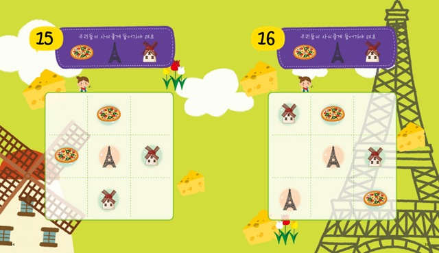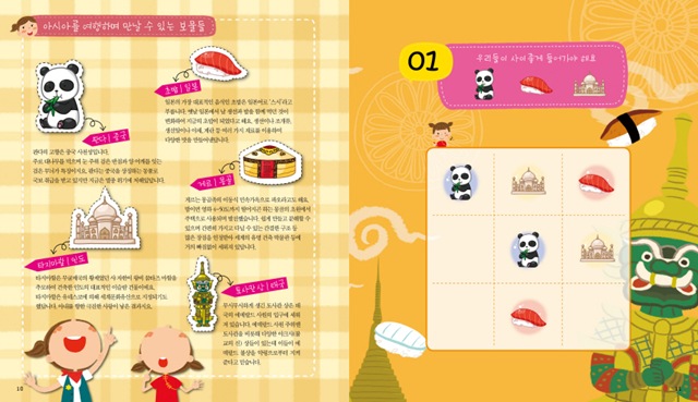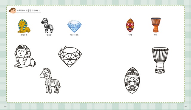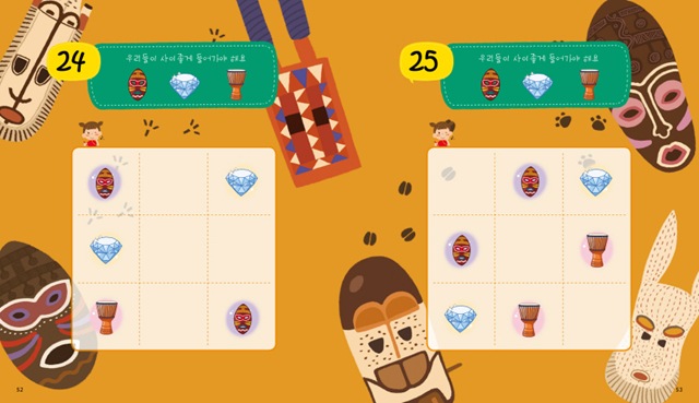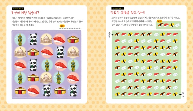 매일매일 두뇌 트레이닝 《아기자기 스티커 스도쿠 2권》:세계편 스티커스도쿠02권표지 제 목: 매일매일 두뇌 트레이닝 <아기자기 스티커 스도쿠> 2권:세계편 저 자: 손호성 그 림: 김혜라 면 수: 96 판 형: 182*210 출판사: 아르고나인 발행일: 2011년 1월 30일 정 가: 8,800원 ISBN : 978-89-93497-74-8 13740 1. 책 소개 아기자기 귀여운 스티커로 두뇌 개발하기! <아기자기 스티커 스도쿠> 시리즈는 단순히 펜을 들고 푸는 기존의 퍼즐북과 달리 예쁜 스티커를 이용해 즐길 수 있는 신개념 퍼즐북입니다. 수학자 레온하르트 오일러의 매직 스퀘어를 응용해 만들어진 스도쿠 퍼즐은 어린이들의 수학적, 논리적 사고를 키워줍니다. 또한 미로와 틀린 그림찾기, 논리 퍼즐 등의 다양한 퍼즐이 수록되어 아이들이 싫증내지 않고 흥미롭게 풀 수 있도록 구성되었습니다. <아기자기 스티커 스도쿠> 2권에 수록된 퍼즐들은 주의 깊게 살펴보기만 하면 힌트를 발견하며 풀어나갈 수 있도록 난이도를 조절, 아이들의 성취감을 얻을 수 있도록 세심하게 배려하였습니다. 수학적 사고력과 따뜻한 감성을 함께 담고자 노력한 <아기자기 스티커 스도쿠> 2권은 테마와 이야기를 강화, 1권과의 차별화를 꾀했습니다. 2권의 테마는 ‘세계여행’입니다. 수채화풍의 따뜻한 그림체에 어울리는 흥미로운 주제 아래 미소와 보미 자매는 세계 각국을 여행하며 다양한 문화와 유물을 접하는 동시에 흥미만점의 스도쿠를 풀어갑니다. 이야기는 <거대한 대륙 아시아>, <문화가 꽃피는 유럽>, <생명이 숨 쉬는 아프리카>, <모험이 가득한 아메리카> 네 가지 챕터로 구성되며 에펠탑, 타지마할, 스핑크스 등 아이콘들에 대한 설명도 담았습니다. 예쁘고 신기한 유물 스티커는 아이들이 흥미를 유발하고 역사와 지리에 대한 상식을 늘려줄 것입니다. 스티커와 색칠하기 부록 포함 책에는 퍼즐을 푸는데 사용하는 스티커 180개와 스티커에 나온 그림들을 직접 채색해 볼 수 있는 색칠하기 코너가 있습니다. 퍼즐에 사용되는 스티커라는 특징을 고려해 붙였다 떼어낼 수 있는 소재로 제작되어 어느 정도 반복 사용이 가능합니다. 퍼즐을 풀고 난 뒤의 여분 스티커는 필통이나 책상 등에 붙여 예쁘게 꾸미기에 사용해도 좋습니다. 2. 목차 스티커 스도쿠 풀어보기 4 퍼즐 하나, 거대한 대륙 아시아 8 -아기자기 퍼즐 1 정말 밤에 피리를 불면 뱀이 나올까? 20 -아기자기 퍼즐 2 무엇이 제일 많을까? 22 -아기자기 퍼즐 3 맛있는 초밥을 먹고 싶어! 23 -아기자기 퍼즐 4 틀린 그림 찾기 24 퍼즐 둘, 문화가 꽃피는 유럽 26 -아기자기 퍼즐 5 누가 내 치즈를 먹었을까? 38 -아기자기 퍼즐 6 튤립 꽃밭에서 미아가 되어 버렸어요 40 -아기자기 퍼즐 7 뽀득뽀득 맛있는 소시지 41 -아기자기 퍼즐 8 틀린 그림 찾기 42 퍼즐 셋, 생명이 숨 쉬는 아프리카 44 -아기자기 퍼즐 9 아기 치타를 찾아주세요 56 -아기자기 퍼즐 10 이건 누구의 발자국일까? 58 -아기자기 퍼즐 11 우리들은 물가에 모여 살고요 59 -아기자기 퍼즐 12 틀린 그림 찾기 60 퍼즐 넷, 모험이 가득한 아메리카 62 -아기자기 퍼즐 13 선물을 고르는 건 즐거워 74 -아기자기 퍼즐 14 보미는 인디언 소녀 75 -아기자기 퍼즐 15 춤추는 선인장 76 -아기자기 퍼즐 16 틀린 그림 찾기 78 재미있는 색칠놀이 80 해답 3. 본문 보기 0090102 009010 012013 022023 026027 034035 038039 044045   052053 060061 062063 072073 084085 거대한 대륙 아시아 문화가 꽃피는 유럽 생명이 숨 쉬는 아프리카 모험이 가득한 아메리카 스티커 스도쿠 문제 아기자기 퍼즐 틀린 그림 찾기 색칠하기 4. 저자 소개 지은이 | 손호성 1970년생. 국내 최초 매직아이 개발, 조선일보, 스포츠조선, 스포츠서울, 스포츠한국, 스포츠칸, 데일리줌, 더시티뉴스, 소년조선일보, 어린이동아, 과학쟁이 등의 매체에 스도쿠와 각종 퍼즐을 연재 중이다. 저서로는 《매일매일 두뇌트레이닝 인도 베다수학》, 《매일매일 두뇌트레이닝 스도쿠 365 시리즈》등 60여권이 있다. 홈페이지: http://www.sudoku365.com 그림 | 김혜라 아기자기한 물건과 여자아이를 그리는 것을 좋아하는 일러스트레이터. 만화를 전공하고 프리랜서 일러스트레이터로 활동, KBS에서 방영하는 TV동화 행복한세상 애니메이션 제작에 참여하기도 했다. 좋아하는 야구팀의 경기가 있는 날에는 가슴이 설레는 야구광이자 해가 맑은 날에는 사진기를 챙기는 아마추어 사진광. 주소 | 서울시 종로구 종로1가 르메이에르 종로타운 B동 2017호 전화 | 070-7535-2958 팩스 | 0505-220-2958 e-mail | atmark@argo9.com Home page | http://www.argo9.com   두뇌트레이닝 아기자기 스티커 스도쿠 2 세계편 |8800 |9788993497748 |