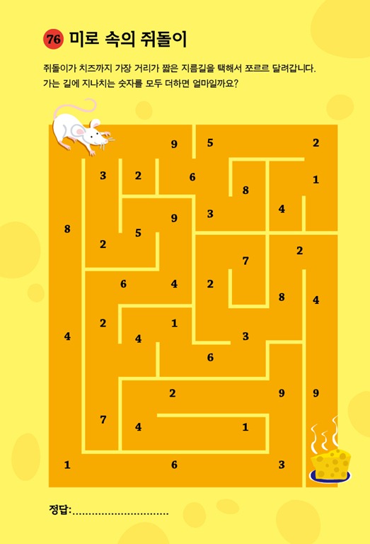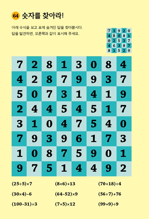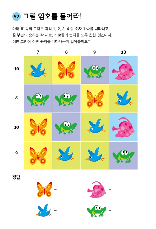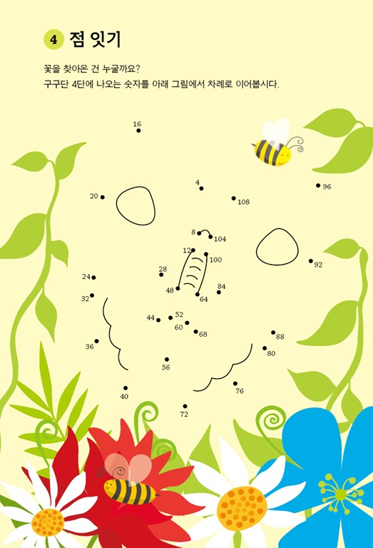 3. 목차 1 위에서 내려다본 우리 마을 / 2 칙칙폭폭 기차 여행 / 3 표 속에 우주가! / 4 점 잇기 / 5 장난감 판매량 / 6 벌집 속으로 / 7 우유 생산량 / 8 가방의 색깔은? / 9 풍선껌 뽑기 놀이 / 10 비행기 여행 / 11 초콜릿 공장 / 12 탑을 그리자! / 13 골프 게임 / 14 없어진 기호를 찾아라! / 15 즐거운 수영장 물놀이 / 16 오늘은 시장가는 날 / 17 게임에 도전하자! / 18 평행을 찾아라 / 19 다른 것은 딱 하나! / 20 선을 따라서 / 21 굴속으로 뛰어들어! / 22 쿠키를 세자! / 23 삼각형은 모두 몇 개? / 24 개구리와 파리 / 25 재미있는 놀이기구 타기 / 26 숫자 맞추기 / 27 슈퍼스타를 찾아라! / 28 과녁을 맞혀라! / 29 캔으로 탑을 쌓자! / 30 금고를 열어라! / 31 초대형 로켓을 그리자! / 32 도형 속에 숫자가? / 33 한 마리도 낚지 못하는 아이는 누구? / 34 차가 막혀요 / 35 빙고에 도전하자 / 36 암호를 풀어라! / 35 꼭꼭 숨어라, 머리카락 보인다! / 36 어떤 무늬일까? / 39 종이를 접자 / 40 알고 보면 같은 모양! / 41 크리스마스 트리 / 42 위성과 행성 / 43 도미노 완성하기 / 44 정글을 조사하자! / 45 케이크 자르기 / 46 숫자 퍼즐 / 47 복슬복슬 내 친구 / 48 달력 퍼즐 / 49 코끼리 엘라의 인생 / 50 다음에는 어떤 모양? / 51 각도는 몇 도? / 52 그림 암호를 풀어라! / 53 카드를 뽑아라! / 54 스도쿠 / 55 돌고래 훈련 / 56 신기한 기계 / 57 피자로 퍼즐을? / 58 멋진 신발장 / 59 주사위 짝 맞추기 / 60 연을 꾸미자 /61 집안일을 더 많이 한 것은 누구? / 62 다음에 올 로봇은 어느 것? / 63 바닷가에서 / 64 숫자를 찾아라! / 65 깡충깡충 뛰어라! / 66 인기 있는 영화는? / 67 그림으로 뺄셈하자! / 68 방울을 터뜨려라! / 69 모양별로 나누자 / 70 시내로 놀러가자! / 71 북극곰을 도와주세요! / 72 방과 후 특별활동 / 73 보물 나눠 갖기 / 74 어떤 모습이 나타날까? / 75 누구 방일까? / 76 미로 속의 쥐돌이 / 77 거울 놀이 / 78 단추와 단추 사이 / 79 지하철 시간표 / 80 암호를 해독해라! / 81 파라오 연대표 / 82 무게를 똑같이! / 83 비 오는 날 / 84 거울에 비친 모습 / 85 헝겊 인형 / 86 몬스터의 간식 / 87 과일 포장하기 / 88 반올림 / 89 요리 시간 계산하기