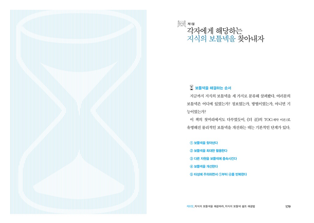 3. 목차 제1장 보틀넥이란 무엇인가? 제1절_ 보틀넥, 무엇이 문제인가? 보틀넥과 병목현상 / 조직의 블랙홀인 보틀넥 / 한 곳의 보틀넥이 전체의 성과를 제한한다 / 보틀넥을 개선하기 위한 5단계 제2절_성과를 좌우하는 사고의 보틀넥 물리적인 보틀넥을 능가하는 사고의 보틀넥 / 지식-선택-생활로 구성된 사고의 보틀넥 제2장 지식-선택-생활의 보틀넥을 분석한다 제1절_지식의 보틀넥은 어떤 구조로 되어 있는가? 명석한 두뇌의 세 가지 요소 정보-방법-기능 / 정보×방법×기능=명석한 두뇌 / 정보, 방법, 기능의 보틀넥 수준을 끌어올린다 제2절_보틀넥을 개선하기 위한 처방법 발목을 붙잡는 요소를 제거한다 / 하나의 요소가 다른 요소의 수준을 끌어올리는 지렛대 효과 / 각 요소를 계속 발전시키면 나선적인 상승효과를 얻을 수 있다 / 기능의 보틀넥으로 학력 저하가 문제로 떠오르다 / 최근 비즈니스 서적의 경향 제3절_지식을 쓸모없게 만드는 선택의 보틀넥 있을 곳을 고르는 선택이 성과를 결정한다 / 인생을 바꾸는 것은 선택의 보틀넥 제4절_지식과 선택을 뿌리째 뒤흔드는 생활의 보틀넥 생활에서 발생하는 3가지의 보틀넥 제3장 지식의 보틀넥을 해결하라, 정보의 보틀넥 제1절_정보의 보틀넥 모르면 그만큼의 대가를 치러야 한다 / 모르면 인생의 수익이 줄어들고 비용이 늘어난다 / 말은 소재이자 도구이며 무기다 / 말과 정보를 가지지 못한 자는 지배당한다 제2절_정보의 보틀넥을 다스리는 전략 정보의 생산성 향상: 시간을 관리한다 / 생산성과 부가가치 시간이라는 개념 제3절_정보의 보틀넥, 이렇게 다스려라: ECRS 시간을 가치있게 활용하는 ECRS의 마법 / Eliminate: 의미 없는 행동 그만두기 / Combine: 버려지는 시간을 부가가치 시간으로 만들기 / Re-order: 일의 순서를 바꿔 시간을 절약하기 / Simplify: 과정을 단순하게 바꿔 시간을 단축하기 / 자신만의 ECRS를 찾아라 제4절_정보의 보틀넥, 이렇게 다스려라: 단명화 단 한 번에 끝내는 단명화(Ephemeralization)의 마법 / 업무에 바로 활용하는 단명화 방법: 표준화와 체크시트 제5절_정보의 보틀넥, 이렇게 다스려라: 정보망을 넓혀라 정보 수집의 생산성을 높이는 방법은 따로 있다 / 속독과 포토리딩: 단시간에 대량의 정보를 수집하기 / 오디오북: 정보 수집의 멀티미디어화 / 멀티태스킹: 동시에 두 가지 일하기 / 세미나: 정보 습득의 효율 높이기 제6절_정보의 보틀넥, 이렇게 다스려라: 외부뇌를 활용하라 인터넷을 외부뇌로 활용한다 / 메일링리스트, 뉴스클립, RSS: 푸시형 정보 선별 / 검색엔진, 상용 DB: 풀형 정보 검색 / SNS, 블로그: 풀·푸시형 정보 교류 / 인적 네트워크: 다른 사람의 정보와 지식을 빌린다 / 정보 수집 비용을 아까워하지 말자 제7절_정보의 보틀넥 해결 이후의 과제 범람하는 정보 / 정보의 관심 영역을 계층별로 구분하라 / 모든 것을 알 필요는 없다! / 정보에서 방법으로 보틀넥이 이동한다 제4장 지식의 보틀넥을 해결하라 방법의 보틀넥 제1절_방법의 보틀넥 방법은 정보의 효과를 높인다 / 방법을 많이 알수록 아웃풋도 풍부해진다 / 프레임워크를 지렛대로 삼는다 제2절_먼저 정형화된 지렛대부터!_프레임워크를 자신의 것으로 만들자 프레임워크는 세상의 단면 / 대표적인 프레임워크 제3절_발전하는 지렛대!_방법론적 프레임워크를 활용하자 논리적인 사고 과정: 로직트리 / 로직트리와 유사한 마인드맵 / 직접 만드는 프레임워크: 추론 / 업무 속도를 비약적으로 향상시키는‘가설을 통한 사고’ / 정보가 부족해도 추론이 가능한 ‘페르미 추정’ / 사고 과정을 활성화하는 그밖의 문제들 제4절_기본적인 프레임워크 누락과 중복을 없애고 똑같은 수준으로 정리하는 MECE / 높은 곳에서 내려다보며 스코핑으로 토론의 무대를 설정한다 / 매트릭스로 나눠본다 / 현실을 모델화해 그 모델 위에서 조작한다 제5절_방법의 보틀넥 해결 이후의 과제 매뉴얼 신봉자는‘밑동을 지키는 사람’이 되지 못한다 / 세 마리의 새는 어디로 갔을까? 제5장 지식의 보틀넥을 해결하라 기능의 보틀넥 제1절_기능의 보틀넥 병법을 모르는 병법서 애독자 / 해답만 찾으려 하지 않는다 / 제2절_기능의 보틀넥, 이렇게 다스려라 ‘재현성’이 있는 현명한 두뇌가 되려면 ‘체험’이 필요하다 / 리스크가 없는 실패를 반복하라 기능을 연습하는 데도 방법론이 있다! 제3절_기능의 보틀넥, 이렇게 다스려라: 탁상 훈련법 끊임없는 연습으로 개별적인 기능이나 기술을 습득한다 / 시뮬레이션으로 기본기를 조합해 조작한다 / 사례를 통해 해석하는 사례 연구 제4절_기능의 보틀넥, 이렇게 다스려라: 현장 연습법 게임…오래되었지만 새로운 공부법 / 디베이트…사고의 배틀 / 롤플레잉… 현실 모의 체험 수·파·리로 달인의 기술을 익히자 / ‘몸에 익히는’ 단계에서 ‘몸속에 스며드는’ 단계로 제6장 지식의 보틀넥을 해결하라 지식의 보틀넥 셀프 해결법 제1절_각자에게 해당하는 지식의 보틀넥을 찾아내자 보틀넥을 해결하는 순서 / 지식의 보틀넥을 찾아내기 위한 힌트 제2절_보틀넥을 개선하는 두 가지 방법 정보에 보틀넥이 있다면 방법을 지렛대 삼아 개선한다 / 방법에 보틀