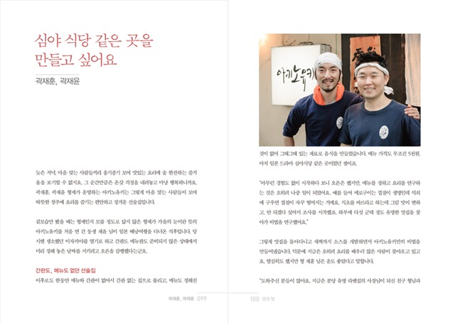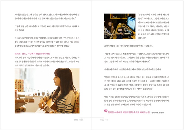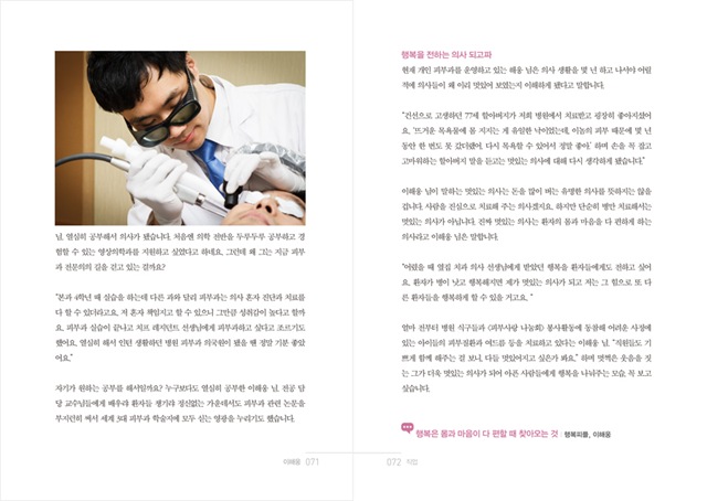 3. 목차 관계 외국 친구 100명 사귀는 게 목표였어요 -고나영 얼마나 행복한지 꼭 보여주고 싶었어요 -권지혜 문제의 핵심은 소통이에요 -김주아 쇠구슬 위에서 날마나 균형을 잡아요 -문형모 선생님, 업어드릴까요 -박지윤 우연이 거듭되면 필연이라고 하잖아요 -양명숙 인형처럼 대하지 말고 같이 놀아주세요 -이종찬 대학 친구가 직장 동료가 되었어요 -임연하, 이혜민 사람 냄새 가득한 소셜 서비스를 꿈꿔요 -조상래 언제까지나 아이와 친구처럼 지내고 싶어요 -조영민 우리는 해답을 이미 알고 있어요 -황상현 직업 헤드헌터는 사람을 설득하는 일입니다 -강마리 놀이가 있어야 사람도 살 수 있어요 -강진숙 목표가 절실하면 시련은 결코 실패가 아닙니다 -문준호 엄마들이 편히 놀 공간을 만들고 싶어요 -백정학 사랑 노래 부르려면 진한 사랑 해봐야죠 -손현정 늘 사람을 대하는 기본에 충실해야 합니다 -신명 혼자서는 어려울 때가 많아요 -오종화 하나를 얻으려면 하나를 포기해야 하는 법이니까요 -이완기 몸은 물론 마음까지 편하게 하는 의사이고 싶어요 -이해웅 커피로 버섯 키우는 농부에요 -이현수 인생 경험담을 노래하는 래퍼도 시인이죠 -전용훈 처음엔 엑셀에 글을 썼어요 -정명섭 친구들 술 사줄 정도는 돈을 벌어야지요 -정지연 힘든 시기를 조금만 지나면 멋진 일이 기다리고 있어요 -최승희 청춘에게 나침반이 되는 책을 만들고 싶어요 -최태선 아르바이트로 번 돈까지 모두 쏟아 부었어요 -홍영은 맛과 멋 콜라 캔을 보고 ‘클래지콰이’를 떠올렸어요 -DJ클래지 심야식당 같은 곳을 만들고 싶어요 -곽재훈, 곽재윤 세상에 오직 하나뿐인 케이크 만들어요 -구윤선 커피 한 잔에도 나쁜 건 넣지 않습니다 -김경 가르치다 보면 더 많이 배우더라고요 -김장우 책하곤 친하지 않은데 요리책이라면 완전 빠져들어요 -김효선 그리운 대신 저는 이름을 얻었어요 -시와 이 집에서 뭐가 제일 맛있나요 -신재호 몸이 즐거워야 마음이 행복하지요 -이규형 처음 본 우쿨렐레를 맥주 여섯 병과 바꿨어요 -이명권 남이 뭐라해도 내가 좋아하는 것을 좋아해야죠 -현태준 나눔 회사 한 번 같이 만들어 볼래? -가면정 커서 뭐가 되고 싶니? -권태훈 누군가에게 도움이 된다는 건 굉장히 행복한 일이에요 -김인호 이유는 없어요. 그냥 좋아서 했을 뿐 -남미경 내 이익과 사회의 이익이 부딪힐 때 무엇을 선택할까요? -모세종 누구나 죽기 전에 꼭 한 번 하고 싶은 일이 있는 거잖아요 -심샛별 일하려는 의지를 심어 주는 게 필요해요 -오영균 관계를 유지하려면 노력해야 해요 -유은정 쓰던 거 주면 욕 먹는다 하더라고요 -윤보람 기부는 남은 물론 나한테도 좋은 일이예요 -이성영 선택에는 책임이 따르는 법이잖아요 -이세라 읽지 않는 책은 가치가 없어요 -이용주 나눔을 생각하는 건 쉽지만 실천하긴 어려워요 -장은혜 소방은 사회적 약자를 위한 복지에요 -정찬영 나눔 어떤 선택이 더 우월하다고는 생각하지 않아요 -김봉현 세상에서 제일 소중한 건 바로 저에요 -김영재 디자인을 해주는데도 제가 얻는 것이 많더라고요 -남정남 저희 록커처럼 사진 찍으면 안 돼요? -이정민, 이주현, 조준형 의사 선생님이 저보고 화병 났다 하더라고요 -박서정 너는 나중에 뭐가 되려고 그렇게 반짝이는 걸 좋아하니? -신화숙 두 번째 행복이 훨씬 더 감동스럽더라고요 -심헌수 경쟁하면서 자존감을 다치는 거죠 -이승미 바퀴벌레 백 마리 보신 적 있어요? -이인택 교과서 보자 했더니 죄다 참고서를 내놓더라고요 -이인희 처음엔 인간 관계의 한 뭉텅이가 비어버린 듯 했죠 -이호영 서비스 하는 사람이 행복해야 손님도 행복해요 -장경숙 아이 보폭에 맞춰 느리게 걸어봤어요 -전혜원 스윙 댄스는 소셜의 매력이 있어요 -주재규 부족하다는 건 더 할 일이 있다는 거잖아요 -한재준 도전 가슴이 뛰고 자다가도 벌떡 일어나는 일을 하고 싶었어요 -김희정 실력은 금방 비슷해져요. 중요한 건 사람을 대하는 마음이죠 -남대연 그 책을 이십대 초반에 읽었더라면 많이 달라졌겠지요 -목남일 어려운 것들일수록 더 좋았어요 -박세희 한 가지 일에 매달릴 필요 없어요 -배명은 중국에서 고개 숙여 인사하니까 상대방이 당황하더라고요 -상문연 2년 동안 영어로 일기를 썼어요 -선현우 현실에 없는 걸 만들고 싶어요 -손호성 무엇인가를 해냈다는 것이 참 행복했어요 -양정희 윗 사람이 주는 일만 받아서 하려니 답답하고 지겹더라고요 -이일희 일곱 가지를 다 잘하는 칠방미인이 될 거에요 -정의형 전공에만 집중하는 건 재미없어요 -한승우 여행 누구나 마음만 있으면 떠날 수 있어요 -김지선 하와이 가서 살래? 좋아! -김진미 아침은 하루 중 백지 같은 시간이에요 -신영진 빛에 따라 여행지의 느낌이 달라요 -우인재 여행은 낡았지만 삶을 지탱해주는 끈이에요 -이경화 아들과 시간을 보내는 가장 좋은 방법 아세요? -이은영 행복하고 싶다면 아픔과 슬픔을 모두 껴안아야 해요 -이지상 일 년에 6개월 정도는 여행을 해요 -정상구 자식 노릇 하느라 아이도 힘들겠더라고요 -홍지원 아름다움 다른 손님이 기다리면 집중할 수가 없어요 -가람 디자인만 하는 건 저와 