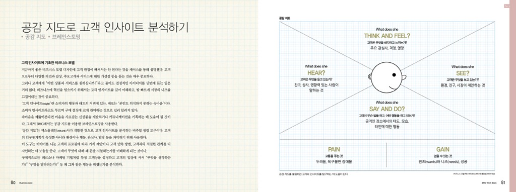 비즈니스 모델 제너레이션 워크북:새로운 사업과 일을 구체화하는 혁신적 비즈니스 발상법 EMB00001e64197b 제 목 : 비즈니스 모델 제너레이션 워크북 저 자 : 이마즈 미키 번 역 : 김혜영 펴낸 곳 : 스펙트럼북스 판 형 : 240*180 면 수 : 191 발행일 : 2014년 01월 25일 정 가 : 16000원 I S B N : 979-11-85423-02-9 13320 ------------------------------------------------------------------------ 1. 책 소개 단 한 장으로 모든 비즈니스 모델을 표현한다! 9가지 블록으로 구성한 ‘캔버스’로 비즈니스 모델에 혁신을! <비즈니스 모델 제너레이션 워크북>은 스위스 로잔대학교 교수인 예스 피그누어가 저술한 세계적인 베스트셀러 ‘비즈니스 모델 제너레이션’을 토대로 누구나 쉽게 캔버스를 이해하고, 활용할 수 있게 구성한 책이다. 비즈니스 모델 제너레이션(이하 BMG)은 그동안 연구원이나 전공자 등 일부 사람들만이 이해할 수 있던 비즈니스 모델을 더욱 단순화시키고 현장으로 끌어내 표준이 되는 프레임워크를 제공해준, 획기적인 이론으로 평가받고 있다. BMG의 핵심은 9개의 블록으로 구성한 ‘캔버스’로 집약될 수 있다. 이 캔버스는 9가지 블록에 간단하게 요소를 채워 넣는 방법으로, 누구나 시각적으로 이해할 수 있는 탁월한 수단이라고 할 수 있다. <비즈니스 모델 제너레이션 워크북>은 총 7개의 파트로 구성되었다. 파트 1에서는 비즈니스 모델 제너레이션의 기본적인 개념과 핵심 도구인 캔버스를 이해할 수 있다. BMG를 처음 접한 독자도 파트 1을 읽으면 개요를 파악할 수 있을 것이다. 파트 2는 조직, 기업의 BMG 활용 사례를 소개, 비즈니스 모델 제너레이션을 기업이나 조직에서 프로젝트 등에 활용할 때의 순서와 함께 캔버스 작성법을 소개한다. 파트 3에서는 개인의 스킬을 높여주는 BMG 활용 사례를 다뤘다. 개인적으로 스킬을 높이려고 하거나 기업을 설립하는 경우 등 다양한 상황에서 비즈니스 모델 제너레이션을 활용하는 방법에 대해 소개한다. 파트 4에서는 비즈니스 모델 디자인 운용하기를, 파트 5에서는 비즈니스 모델 제너레이션 활용의 효과를 높여줄 테크닉과 힌트를 소개한다. 파트 6과 파트 7 부록에서는 국내 및 해외 기업과 조직, 개인의 캔버스 작성 사례를 소개한다. 기업을 분석하다 난관에 부딪쳤을 때 파트 6에 실린 타사의 사례를 참고하면 큰 도움이 될 것이다. 대기업부터 소상공인까지, 사원 연수는 물론 워크숍에 최적화 피그누어 교수는 처음부터 BMG는 누구나 알기 쉬운, 단순한 캔버스를 목표로 구상했다고 밝혔다. BMG의 최대 장점은 단 한 장으로 모든 비즈니스 모델을 표현할 수 있다는 것이다. 또한 업종과 연령에 관계없이 모두 함께 토론할 수 있는 공통언어로 활용할 수 있으며 현상 분석 및 검증과 수정도 용이하다. 검증과 수정의 반복은 자연스럽게 노하우로 쌓이게 된다. 이처럼 BMG는 디자인 사고에 최적화된 수단이다. BMG의 캔버스는 아날로그와 디지털을 번갈아가며 사용할 수도 있다. 화이트보드나 종이, 그리고 필기구만 있으면 캔버스를 그려 토의가 가능하며 관련 앱에 보관 및 응용이 가능하다. 하지만 저자는 가급적 아날로그 방식을 추천하고 있다. 편리함을 떠나 캔버스에 크게 쓰면 정신이 또렷해져서 창의적인 의견을 많이 낼 수 있다는 것이다. 다양한 의견을 활발히 교환하는 데는 다 같이 서서 보면서 작업을 진행하는 것이 효과적이기 때문이다. 이러한 유효성 때문에 제너럴일렉트릭(GE) 같은 대기업부터 소상공인, 창업가, 컨설턴트에 이르기까지 BMG는 많은 기업과 조직으로부터 높은 평가를 받으면서 도입이 진행되고 있다. 가까운 일본에서도 창업 연수나 대학 수업에서도 많이 활용되고 있다. BMG의 캔버스는 개인 이외에도 기업 연수나 교육 프로그램에서도 충분히 활용 가능한 프레임워크라 할 수 있다. 고객이 원하는 상품의 가치가 무엇인가를 고민해보지 않으면 글로벌 비즈니스경쟁에서 살아남기 힘들다. 디자인 사고의 수단으로 BMG의 캔버스는 활용할만한 가치가 있다. <비즈니스 모델 제너레이션 워크북>은 이를 돕는 충실한 길잡이 역할을 해줄 것이다. 2. 본문 EMB00001e64197e EMB00001e641980 EMB00001e641982 EMB00001e641984 EMB00001e641986 EMB00001e641988 3. 목차 이 책의 구성 추천의 글 INTRODUCTION COMIC BMG 단숨에 이해하기 INTERVIEW ‘캔버스’의 아버지가 전하는 《비즈니스 모델 제너레이션》의 탄생 배경 기업 인터뷰 1 고쿠요 주식회사 <신상품을 개발을 검토하는 공통 포맷으로 활용> 기업 인터뷰 2 후지쯔 주식회사 <캔버스가 한 장으로 정리되어 누구나 한눈에 이해하기 쉽다> 기업 인터뷰 3 주식회사 SEC <유동적인 인재 활성화와 조직 활성화를 목표로> PART 1 Tutorial 비즈니스 모델 제너레이션의 기본 BMG 활용의 흐름과 순서 4단계로 작성하기 캔버스의 기본과 작성 방법 이해하기 캔버스의 각 블록을 기술하기 위한 개념 이해 1 캔버스의 각 블록을 기술하기 위한 개념 이해 2 비즈니스 모델 캔버스 그리기 CASE 1 현상 파악을 위한 캔버스 CASE 2 혁신을 위한 캔버스 PART 2 Business Case 기업과 조직에서의 BMG 활용 워크숍과 그룹 토의의 중요성 도입에서 운용까지의 흐름과 실무 활용법 CASE 1-1 신규 사업 기획 CASE 1-2 