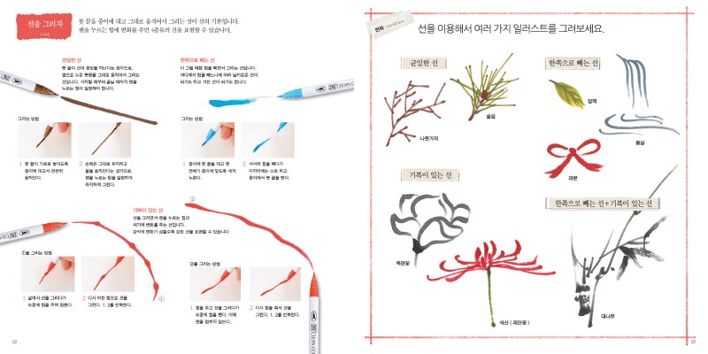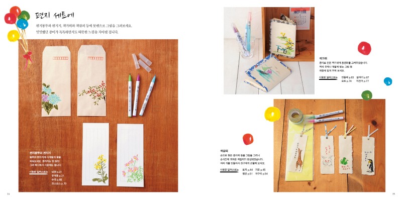 제 목 : 붓펜으로 그리는 일러스트 저 자 : 이토 쇼 옮 김 : 김현영 펴낸 곳 : 봄봄스쿨 판 형 : 200*200 면 수 : 88 발 행 일 : 2016년 8월 10일 정 가 : 12,000원 I S B N : 979-11-5895-037-8 14650 ------------------------------------------------------------------------ 1. 책 소개 문방구에서 판매하는 캘리그라피 펜, 붓 펜으로! 정성이 가득 든 자신만의 그림과 문자로 표현하는 280가지 방법! 요즘 같은 디지털 시대일수록 오히려 다양한 아날로그 아이템이 사랑을 받곤 합니다. 안부를 묻는 문자 메시지보단 손으로 정성스럽게 쓴 편지 한 장이 더욱 가슴에 와 닿는 것처럼 말이죠. 만일 붓으로 그림을 그려 놓고 축하 인사를 쓴다면 어떨까요? 다이어리나 편지 봉투에 붓으로 직접 그린 간단한 그림만 넣어도 분위기는 확 달라집니다. 마음이야 굴뚝같아도 먹이며 벼루 등을 갖춰 놓고 그림을 그리기가 쉽냐고요? 이럴 때 아주 유용한 것이 바로 붓 펜입니다. 흔히 붓 펜 이라고 하면 예식장이나 전시회 등에서 방명록을 쓸 때나 사용하는 필기구라고 생각합니다. 그러나 시중에는 먹색 말고도 색색의 붓 펜이 많이 나와 있습니다. 일러스트를 그리는 데 이보다 더 간편한 도구가 어디 있을까 싶을 정도입니다. <문방구 붓 펜 일러스트>는 붓 펜을 이용한 일러스트가 280개나 담긴, 참신한 일러스트를 열망하는 당신에게 적합한 그런 책입니다. 점과 선, 그리고 덧칠로 완성하는 붓 펜 일러스트는 일단 그 매력에 빠지면 헤어나기 어렵습니다. 붓 칠을 할 때마다 전해지는 종이의 질감은 그 자체로도 충분히 즐거울뿐더러 일단 일러스트가 완성되면 평범한 제품이 귀여우면서도 따뜻한 느낌을 자아내는 유니크한 아이템으로 변신을 하기 때문입니다. 이 책에는 하나의 일러스트를 완성하는 과정이 순서대로 나와 있습니다. 누구든 그 과정을 따라 하면 멋진 그림을 완성할 수 있습니다. 몇 번씩 따라 해보고 익숙해지면 조금씩 변화를 주면서 자기만의 독특한 그림을 창조해 보세요. 이제 가방에 볼펜과 함께 붓 펜을 넣어보면 어떨까요? 분명히 예상치도 못했던 즐거움을 선사해 줄 겁니다. 물론 <문방구 붓 펜 일러스트 280>도 잊지 말고 챙겨야겠죠? 2. 본문 보기