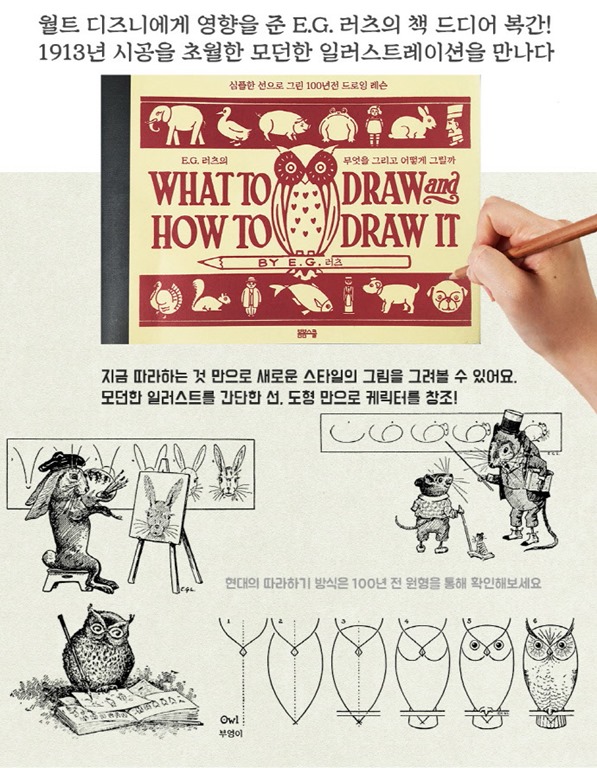x9791158950255 2016년 06월 25일 80쪽 | 360g | 26813015mm ISBN-13 9791158950255 ****1.설명   심플한 선으로 그린 100년 전 드로잉 레슨 1913년에 발행된 환상의 책이 시공을 초월해서 다시 돌아왔다. 이 책은 100년 전에 영국에서 발행 오랫동안 절판되어 있던 세계에서 처음 삽화 교습의 복각 판입니다. 다양한 것들을 의인화하여 단계별로 가르치는 기법을 취한 E.G.러츠는 이 책에서, 사람, 건물, 풍경 등 다양한 주제의 소묘를 알기 쉽게 설명합니다. 간단한 선으로 그려진 삽화는 오랜 세월이 지났지만 지금도 신선한 매력과 현대적인 분위기를 가지고 있습니다. 그림을 그리는 즐거움을 전 해주는 귀중한 1권입니다. 월트 디즈니를 시작으로 수많은 작가들에 영향을 준 E.G 러츠의 드로잉 레슨은 지금 다시 봐도 모던한 감각의 일러스트라 할 수 있습니다. 젊은 날의 디즈니는 러츠의 화풍에 영향을 받아 그림 기법을 배우기도 하였고 영감을 얻어 새로운 작품 활동을 할 정도였다. 러츠는 신문지면, 아동서의 삽화, 만화, 캐릭터를 제작하였고 다양한 분야를 넘나들며 활동을 하였다. 삽화나 애니메이션의 기법에 관한 다수의 책을 집필할 정도의 탄탄한 실력을 가지고 있으며 현대에도 그의 화풍과 일러스트기법은 여전히 따라할 만한 가치가 있습니다. 직선, 원, 작은 도형에서 시작해서 하나하나 세밀한 삽화로 만들어가는 과정을 따라 하기 형식으로 차근히 배울 수 있으며 도형을 결합하여 탄생하는 다양한 동물, 건물, 인물 등의 묘사는 그림을 그리는 분들에게는 새로운 스타일의 작화법을 배울 수 있으며 그림을 처음 그리는 분들에게 훌륭한 가이드가 될 것입니다.   drawing_01 drawing_02 drawing_03 drawing_04     2. 목차 그리는 방법 오각별 그리기 / 탑 / 등대 / 성 / 텐트 / 정육면체 / 집 / 헛간 / 장난감 말 / 장난감 / 왕관 두루미 / 두루미 / 고양이 / 쥐 / 특이한 물고기들 / 물고기 / 부들 / 잠자리 / 수련 / 개구리 / 올챙이 / 달리는 토끼 / 메추라기 / 달리는 토끼 / 토끼 / 암탉과 병아리 / 백조 / 오리 / 거위 / 새끼 거위 / 소 / 염소 / 돼지 / 불도그 / 개 / 말 / 칠면조 / 공작비둘기 / 벌새 / 여러 가지 새 / 제비 / 날아가는 새 / 부엉이 / 부엉이 / 잉꼬와 앵무새 / 다람쥐 / 곰 / 너구리 / 아기 코끼리 / 서커스 코끼리 / 원숭이 / 코끼리 / 펠리컨 / 직선으로 그린 새들 / 캥거루 / 기린과 낙타 / 직선으로 그리기 / 얼굴-간단히 그리기 / 인물-남자-직선으로 그리기 / 얼굴-직선으로 그리기 / 우스꽝스러운 광대의 얼굴 / 재미있는 방법으로 얼굴 그리기 / 유쾌한 표정 / 옆모습-간단히 그리기 / 표정 / 얼굴-곡선 / 계란형 얼굴 그리기 / 어린 소녀와 소년 / 둥글둥글한 인물 / 독특한 방법으로 시작하기 / 인물-남자 / 인물-여자 / 컴퍼스로 계란형 그리기/ 계란형과 타원 그리기/ 타원 그리는 방법/ 집/ 수채물감 사용하는 요령/ 여자/ 닭/ 토끼   3. 저자 : 러츠 에드윈 조지 Lutz Edwin George 애니메이터뿐만 아니라 월트 디즈니를 비롯한 많은 제작자에게 영향을 준 인물로도 유명하다. 각 신문의 아동 난의 삽화와 만화 캐릭터를 제작하는 등 다방면에 걸쳐 활약, 삽화 나 애니메이션 기법에 관한 책을 다수 집필했다.   EMB00003ae813bf 주소 | 서울시 마포구 동교동 166-2 목화빌딩 8층 전화 | 070-7535-2958 팩스 | 0505-220-2958 e-mail | atmark@argo9.com Home page | http://www.facebook.com/bombomschool E.G. 러츠의 무엇을 그리고 어떻게 그릴까 미리보기 [도서] E.G. 러츠의 무엇을 그리고 어떻게 그릴까 (기대별점 : 스케치 연습장 (100명, ~7/31),양장) E.G 러츠 저 | 봄봄스쿨 | 2016년 06월 10,000원 → 9,000원(10% 할인) | YES포인트 500원(5% 지급)