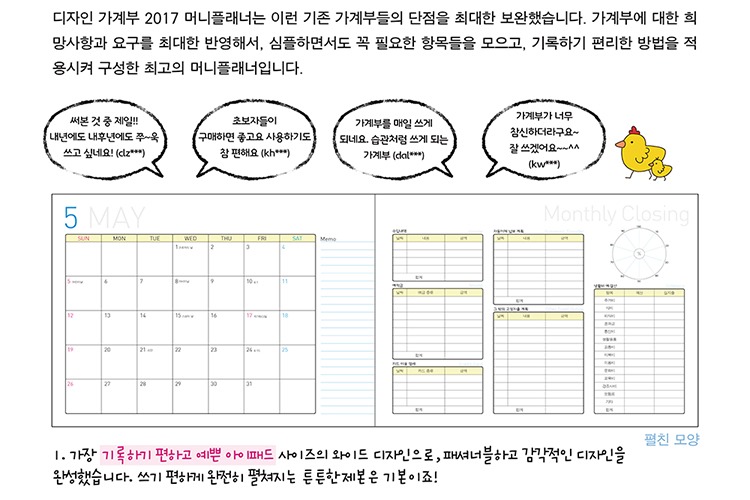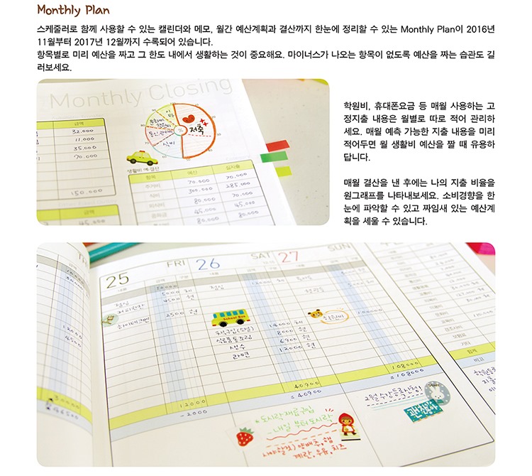 1. 도서명 : 2015 가계부 머니플래너 / 저자 : 편집부 /펴낸 곳: 아르고나인 미디어그룹 2. 중량, 크기 : 300g, 240*180cm 3. 면 수 : 208쪽 4. 발행일 : 2016년 9월 15일 5. 입고일 : 2016년 9월 25일 입고 예정 6. 정 가 : 12,000원 7. I S B N : 8809332971949 8. 제조국 : 국산 9. KC인증 여부 : 해당없음 10. 재질 : 종이 / 연령 : 전 연령 11. 품질 보증 : 파본 또는 성능에 문제가 있을 시에는 구입 후 일주일 이내에 구입처를 통해 교환 12. 책임자 : 고객센터 070-7535-2958 ------------------------------------------------------------------------ 1. 책 소개 가계부를 쓴다고 모두 부자가 되는 것은 아닙니다. 하지만 가계부를 쓰지 않고 부자가 될 수 없습니다. 부자가 되는 첫 번째 전략, 머니 플래너!! 2017 가계부 머니플래너는 그냥 단순한 가계부가 아닙니다. 일상의 기록을 통해 날마다 업그레이드되는 라이프스타일을 만들어가는 스마트한 라이프 플래너입니다. 연말연시가 되면 누구나 야심찬 계획 한 두 개쯤 세우게 되죠. 그 계획을 실현하기 위해서는 목돈이 필요한 경우가 많을 테고요. 하지만 돈을 모으는 습관은 그리 쉽게 생기지 않는다는 게 문제! 그래서 다들 가계부를 장만하고 야심찬 계획을 세우곤 합니다. 그런데 혹시 작년에도 재작년에도 가계부를 샀었지만 책상 한구석에 아니면 어디 처박혀 있는지도 모르는 건 아닌가요? 마음먹은 대로 꾸준히 잘 쓰지 못하는 가계부 습관 때문에 그냥 “내가 너무 게으른가보다, 내가 의지력이 약해서 그렇지 뭐….”하며 자책하는 건 아닌가요? 흔히 접하는 가계부들은 너무 복잡하거나 쓰기 불편해서 꾸준히 가계부를 쓰는 습관을 기르기 힘들었을 거예요. 내 생활 패턴에 딱 맞고 쓰기 간편한 가계부만 있다면 누구나 돈 모으는 습관, 가계부를 꾸준히 쓸 수 있겠죠. 그 때문에 머니플래너가 탄생하게 된 거랍니다. 2017 가계부 머니플래너는 기존 가계부들의 단점을 최대한 보완했습니다. 가계부에 대한 희망사항과 요구를 최대한 반영해서, 심플하면서도 꼭 필요한 항목들을 모으고, 기록하기 편리한 방법을 적용시켜 구성한 최고의 머니플래너입니다. 2012년 첫 출시 이래 5년 연속 가계부 돌풍을 일으킨 베스트셀러이기도 합니다. 그럼, 어떤 특징이 있는지 살펴볼까요? 특징 : 심플하면서 질리지 않는 디자인과 실용성, 직접 써보면 확실히 느껴집니다! 1. 가장 기록하기 편하고 예쁜 아이패드 사이즈의 와이드 디자인으로, 심플하면서도 질리지 않는 디자인을 완성했습니다. 쓰기 편하게 활짝 펼쳐지는 튼튼한 제본은 기본이죠! 2. 오른쪽 상단 모서리를 과감히 쳐낸 머니플래너 고유의 스마트 에지(Edge) 디자인! 기록중인 페이지나 중요한 페이지, 자주 쓰는 페이지에, 잘라낸 원래 모서리 모양에 맞게 포스트잇이나 마스킹테이프를 붙여 사용하세요.