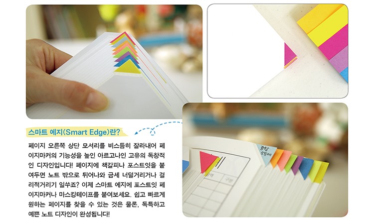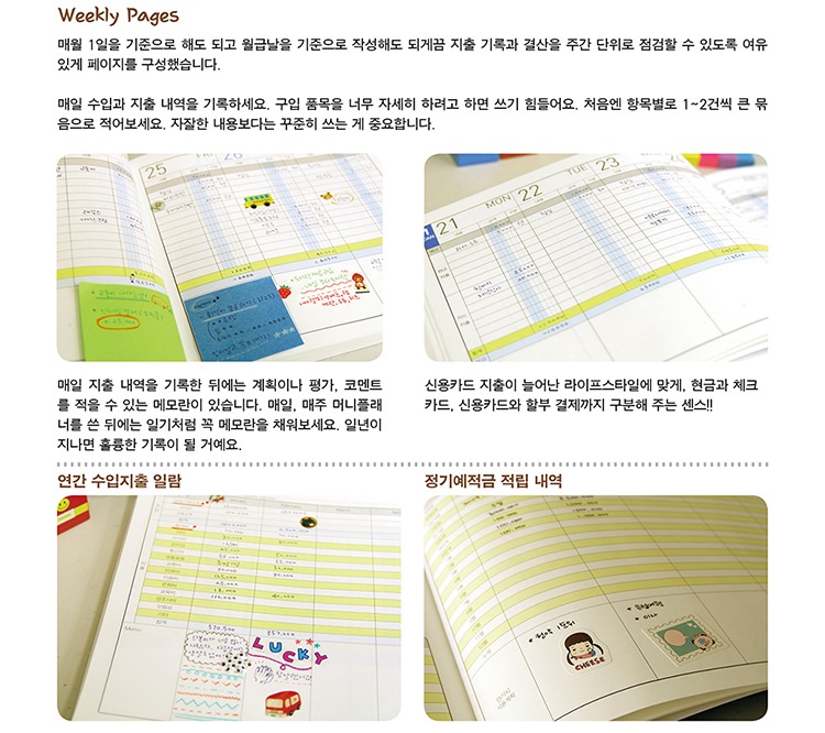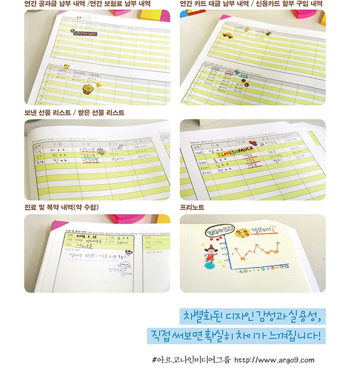 스마트 에지(Smart Edge)란? 페이지 오른쪽 상단 모서리를 비스듬히 잘라내어 페이지마커의 기능성을 높인 아르고나인만의 독창적인 디자인입니다! 기록 중인 페이지나 중요한 페이지, 자주 쓰는 페이지에 책갈피나 포스트잇을 붙여두면 노트 밖으로 튀어나와 금세 너덜거리거나 걸리적거리기 일쑤죠? 이제 스마트 에지에 포스트잇 페이지마커나 마스킹테이프를 붙여보세요. 쉽고 빠르게 원하는 페이지를 찾을 수 있는 것은 물론, 독특하고 예쁜 노트 디자인이 완성됩니다! 3. 복잡하고 어지러운 가계부는 이제 그만! 최대한 심플하면서 편안한 컬러 매치로 매일매일 가벼운 마음으로 꾸준히 기록할 수 있습니다. 감성적인 표지 일러스트는, 쓰는 사람의 센스를 한껏 돋보이게 합니다. 자꾸만 쓰고 싶어지는 머니플래너가 될 거예요. 4. 불필요한 정보 페이지는 과감히 삭제하고, 머니플래너의 기능성을 높였습니다. 주간, 월간 기록과 결산, 꼭 필요한 연말 결산 항목과 상시 관리 항목, 예산 칸을 도입해 계획적으로 소비할 수 있게 합니다. 편한 방식대로 예산 대신 수입을 기록해도 괜찮습니다. 5. 매월 1일 또는 월급날? 언제를 기준으로 시작해도 효율적으로 사용할 수 있도록 구성했습니다. 신용카드 지출이 늘어난 라이프스타일에 맞게, 현금과 체크카드, 신용카드와 할부 결제까지 구분해 주는 센스!! 6. 권말에 가족 모임이나 친구들과의 파티, 여행, 생일잔치, 집들이 등을 계획할 때 편리한 프로젝트 기록 칸을 추가했습니다. 일정과 참석하는 멤버, 준비물, 주의사항 등을 메모해두고 편리하게 활용해 보세요. 2. 내용 보기