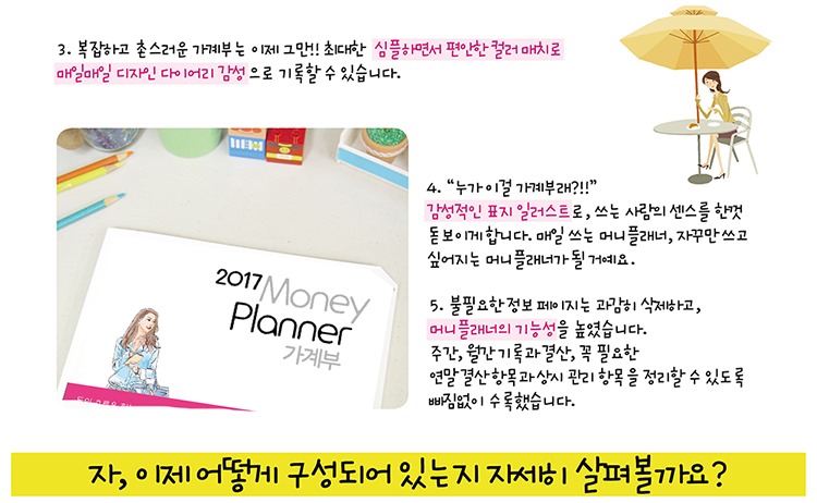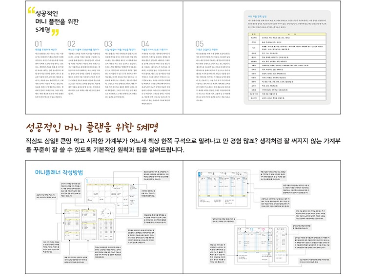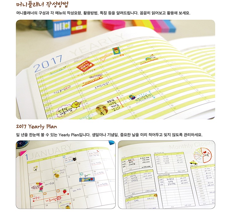 3. 구성 성공적인 머니 플랜을 위한 5계명 머니플래너 작성방법 2017 연간 캘린더 연간 캘린더 (2015년 1월~2016년 1월 총 13개월) 월간 캘린더 & 예결산 일간 수입지출 & 주간 결산 연간 수입지출 일람 다용도 리스트 정기예적금 적립 내역 보낸 선물 리스트 / 받은 선물 리스트 프로젝트 플랜