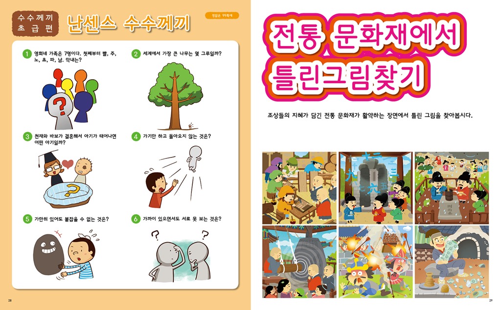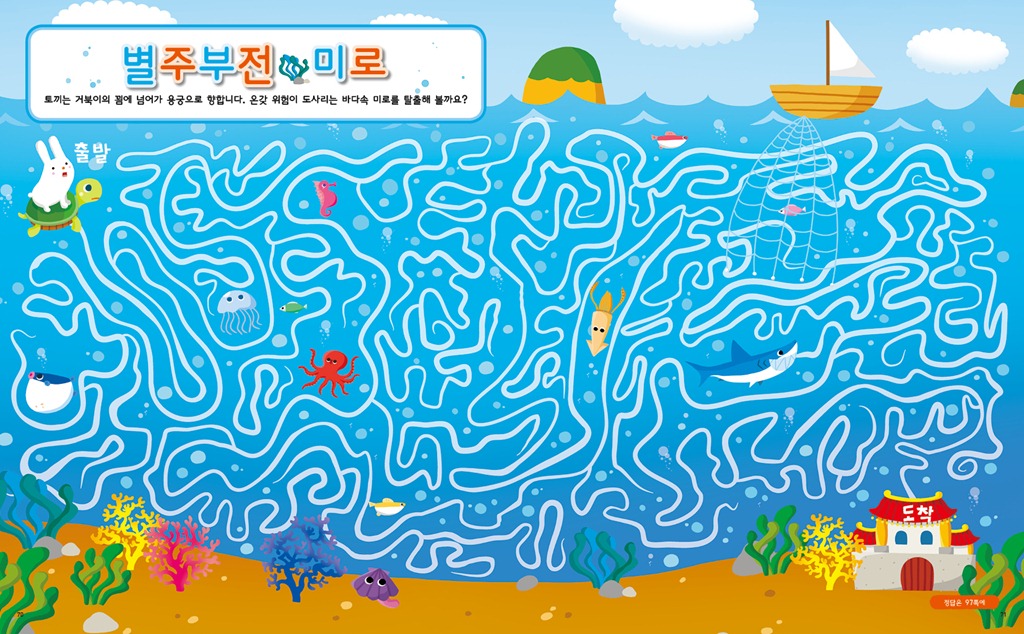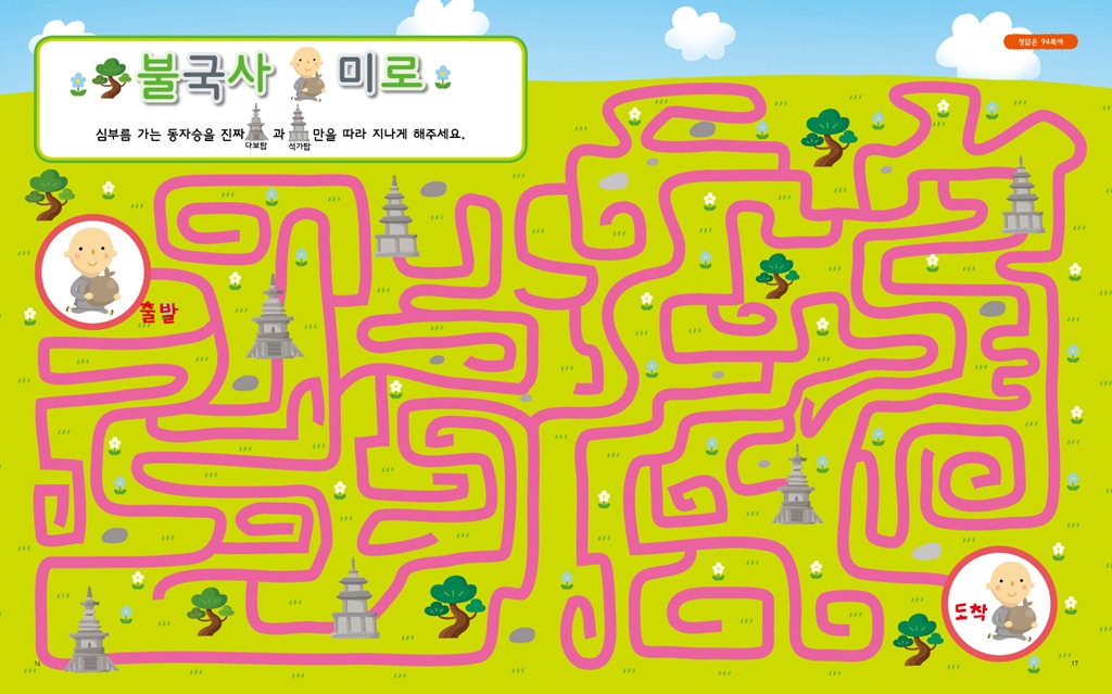 매일매일 두뇌 트레이닝 미로대탈출2 -한국사편 제 목 : 미로 대탈출2 -한국편- 저 자 : 편집부 펴낸 곳 : 봄봄스쿨 판 형 : 210*260 면 수 : 99 발행일 : 2016년 10월 20일 정 가 : 6,500원 I S B N : 9791158950521 ------------------------------------------------------------------------ 1. 책소개 화제의 베스트셀러 미로 대탈출 속편 출간!! 보다 재밌고 더욱 강력해졌다!! 출간 이후 각 온라인서점 놀이·유아 부문 수위를 휩쓸었던 화제의 <미로 대탈출77> 속편이 드디어 나왔다. 전작 <미로 대탈출77>은 독특한 그림체에 기존의 단조로운 미로책 패턴을 벗어나 ‘숨은그림찾기’, ‘틀린그림찾기’, ‘난센스 퀴즈’ 등의 다채로운 구성과 난이도 있는 미로로 많은 사랑을 받았다. 이번에 출간되는 <미로 대탈출2-한국편>은 전작의 장점은 고스란히 살리면서 한국의 문화유산과 유적지, 위인, 전래동화 등을 소재로 삼아 친근함을 더했다. 창덕궁, 석굴암, 불국사 등의 문화유적지에서 미로를 즐기고, 팔만대장경, 고려청자, 신기전을 배경으로 틀린 그림을 찾으며, 주몽, 광개토대왕, 이순신 등의 활약상을 보며 숨은 그림을 찾을 수 있다. 여기에 별주부전, 선녀와 나무꾼, 혹부리 영감 등. 전래동화의 한 장면 속으로 들어간 고난이도의 미로 퍼즐이 아이들의 승부욕을 자극한다. 이밖에 전작에 없었던 신기한 매직아이와 한국의 전통 문화와 역사를 배울 수 있는 정보 페이지를 추가, <미로대탈출2-한국편>은 한층 발전된 책으로 거듭났다. 최고의 에듀테인먼트 교재 ‘미로찾기’는 출발점으로부터 목표까지 가는 동안 여러 번의 시행과 착오를 통해 학습 능력이 올라가고 또 자연스럽게 목표를 향한 집중력을 기를 수 있는, 최적의 학습도구이다. ‘숨은그림찾기’와 ‘틀린그림찾기’ 역시 많은 주의력이 요구되는 퍼즐들이다. 많은 유아교육 전문가들은 놀이교육을 통한 자연스러운 능력배양을 우선으로 손꼽는다. 교육은 딱딱하고 지루할 때보다 재미있고 즐거울 때 더 큰 효과를 나타내기 때문이다. 그런 의미에서 <미로대탈출2-한국편>은 책장을 넘기다 보면 절로 집중력과 사고력이 향상되는, 최고의 에듀테인먼트 교재로 추천할 수 있다. 보는 즐거움과 푸는 재미를 동시에! <미로대탈출2-한국편>은 퍼즐북의 명가로 발돋움한 출판사 아르고나인의 편집부가 심혈을 기울여 기획한 작품으로 국내 최고의 퍼즐 전문가들이 모여 제작을 맡았다. 그야말로 퍼즐의 장인들이 한 장 한 장 정성을 다해 만든 작품으로 독자들에게 보는 즐거움과 푸는 재미를 동시에 선사할 것이다. <미로대탈출2-한국편>에 수록된 퍼즐들은 뒤로 갈수록 난이도가 높게 꾸며져 있다. 초반엔 쉬운 퍼즐로 요령과 성취감을 얻을 수 있도록 배려한 후 중반 이후엔 난이도를 올려 보다 많은 집중력과 사고력을 요구하는 문제로 구성되었다. 가족은 물론 친구들과 때론 협력하고 또 때론 경쟁하며 게임을 즐기다보면 집중력과 사고력은 절로 배양될 수 있을 것이다. <미로대탈출-한국편>은 보다 재밌고 더욱 강력해진 퍼즐로 독자들의 시선을 사로잡을 것으로 기대하고 있다. 2. 본문보기