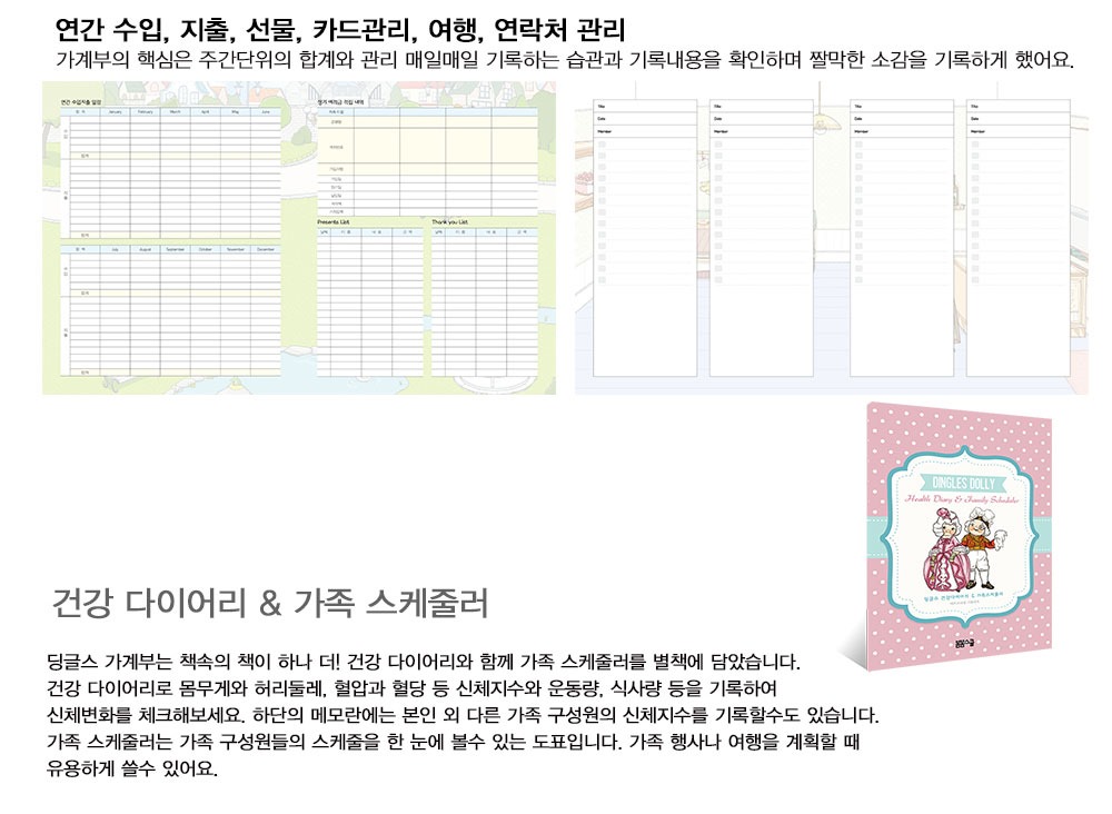 EMB000020303715 ----------------------------------------------------------------------------------- 017 딩글스 가계부 ; 금전운을 부르는 CASH BOOK 1. 도서명 : 2017 딩글스 가계부 / 저자 : 편집부 /펴낸 곳: 봄봄스쿨 2. 중량, 크기 : 600g, 210*257mm 3. 면 수 : 208쪽 4. 발행일 : 2016년 10월 10일 5. 입고일 : 2016년 10월 15일 입고 예정 6. 정 가 : 12,000원 7. I S B N : 8809332971963 8. 제조국 : 국산 9. KC인증 여부 : 해당없음 10. 재질 : 종이 / 연령 : 전 연령 11. 품질 보증 : 파본 또는 성능에 문제가 있을 시에는 구입 후 일주일 이내에 구입처를 통해 교환 12. 책임자 : 고객센터 070-7535-2958 ------------------------------------------------------------------------ 1. 책 소개 2017년은 딩글스 캐릭터 가계부와 함께! - 귀여운 딩글스와 매월 새로운 기분의 디자인으로 꼼꼼하고 알찬 구성 - 기분에 따라 표지를 바꿔 끼워 넣을 수 있는 표지 2매 증정 - 영수증을 수납할 수 있는 비닐 커버 + 건강 다이어리 + 가족 스케줄러 별책증정- 가정의 금전운을 부르는 부적 재물자래부(財物自來符) 증정 2. 내용 보기   d1_01d1_02d1_03d1_04d1_05d1_06 매일매일 일기를 기록하듯 행복한 내일을 설계하세요 가계부는 합리적인 소비 생활을 돕는 검증된 도구예요. 하지만 굳게 마음을 먹고 가계부를 구입해도 작심삼일로 끝나고 끝내는 어디 있는지도 모르는 경우가 많아요. 아무래도 그 원인은 기존 가계부들이 너무 복잡하거나 쓰기 불편해서 꾸준히 쓰는 습관을 기르기 힘들어요. [2017 딩글스 가계부]는 요즘처럼 현금보다는 카드 사용빈도가 높고 다양한 포인트를 활용하는 등 생활 방식에 딱 맞게 고안한 디자인 가계부로 쓰기 편한 구성은 물론 월간, 주간을 기본으로 하여 매일 한 장씩 펜으로 입출금을 기록하고 정리하다 보면 돈의 흐름을 한 번에 알 수 있도록 배열했어요. 소비 패턴을 파악하고 돈이 어디로 빠져나가는지를 점검하는 것은 물론 주부에게는 꼭 필요한 핵심 정보도 빠짐없이 담았어요. 가벼운 마음으로 알뜰지수를 점검할 수 있으며 현명한 가계부 작성 요령도 배울 수 있어요. 생활비 중심으로 그날 그날 소비한 영수증 금액과 매주, 매월의 결산을 통해 아낄 수 있는 비용을 저축으로 돌려 절약을 통해 얻을 수 있는 비용계산도 할 수 있게 구성되었습니다. 스마트함에 아이디어를 더하다요즘 많이 쓰는 스마트폰 가계부는 편리하긴 하지만 한 눈에 돈의 흐름을 파악하기 어렵다는 단점이 있어요. 이에 반해 [2017 딩글스 가계부]는 단번에 소비 패턴을 알 수 있는 것이 최대 장점으로 무엇보다 가계부는 손으로 차근차근 적어야 기억에 오래 남고 과소비에 대해 반성도 할 수 있어요. 지출 계획을 짜는 데는 종이 가계부가 스마트폰과 달리 생각할 시간과 전체 돈의 흐름을 생각할 수 있어 오히려 효율적이에요. 건강 다이어리와 가족 스케줄러 책 부록 다이어리 가족의 건강을 관리할 수 있는 체중, 혈당, 식단관리는 물론 아이의 성장 과정도 기록할 수 있어 기존 가계부에 부족한 부분을 제공해요. 또한 가족의 스케줄을 관리할 수 있는 다이어리도 있어 1년간 가족의 행사나 여행계획, 공연, 문화생활, 휴가계획, 방학, 경조사 등을 한눈에 볼 수 있게 기록할 수 있게 구성했어요. 친근한 딩글스 캐릭터와 즐거운 가계부 쓰기 70년대 못난이 인형같이 친근한 딩글스 인형들이 살고 있는 집을 배경으로 디자인한 딩글스 가계부는 19세기 작품이라고 생각할 수 없는 미국 출신의 일러스트레이터 그레이스 드레이튼의 작품을 현대적인 감각으로 새로 색칠하고 표정을 만들었어요. 그녀의 섬세한 관찰력과 탁월한 그림실력으로 인스타그램이나 핀터레스, 플리커 등의 SNS에서 여전히 인기를 얻고 있어요. 2017 딩글스 가계부에서는 계절별 인형들의 다양하고 새로운 모습을 만나게 되요. 3. 구성 알뜰살뜰 재테크2016 연간 캘린더나의 알뜰지수는?스마트한 가계부 작성 요령 십계명 가계부 본문가계부 작성 방법월간 캘린더 &수입내역 &예·적금 &자동이체 &예결산 월 스케줄 일간 수입지출 &주간 합계 연간 수입지출 일람/정기예적금 적립 내역/보낸 선물 리스트/받은 선물 리스트카드 관리표/카드 사용 내역/보험료 납부 내역/의료비 납부 내역메모장 프로젝트 플랜연락처 목록 4. 캐릭터 디자인 : 그레이스 드레이튼 미국 태생 일러스트레이터로 돌리 딤플스와 고양이 공주라는 만화를 연재했다. ‘캠벨 스프 키즈‘ 광고 캠페인으로 여성지에 알려졌으며 돌리 딩글 종이 인형이 대표작이다. 그녀의 여동생 마가렛 G. 헤이즈와 함께 작품 활동을 하기도 하였고 여성 작가의 홍보와 작품을 소개하는 필라델피아 예술 단체인 ‘더 플라스틱 클럽‘의 멤버이기도 하다. 5. 저자 : 아르고나인 스튜디오 아르고나인 스튜디오는 기획자, 작가, 아티스트, 일러스트레이터, 발명가 등 다양한 인재가 모여 만든 기획 창작 집단으로 실험성과 재미, 유익함을 동시에 줄 수 있는 콘텐츠를 개발하기 위해 노력하고 있다. 아르고나인 스튜디오는 도서를 비롯해 어플리케이션, 장난감 등 원 소스 멀티 유즈를 지향한다. EMB000020303717 주소 | 서울시 마포구 동교동 166-1 목화빌딩 8층 전화 | 070-7535-2958 팩스 | 0505-220-2958 e-mail | atmark@argo9.com 