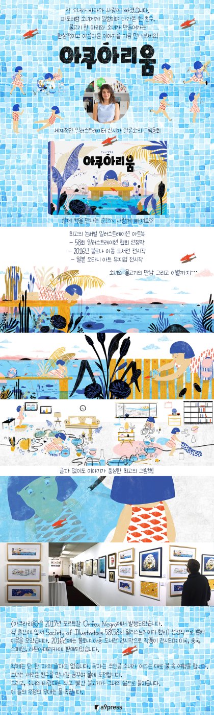 **<아쿠라리움>은 2017년 포르투갈 'Orfeu Negro'에서 발행되었습니다. 책 출간에 앞서 'Society of Illustrators _58'(58회 일러스트레이터 협회) 선정작으로 뽑혀 이목을 모았습니다. 2016년에는 '볼로냐 아동 도서전' 전시작으로 작품이 전시되며 미국, 중국, 스페인, 라틴아메리카에 판매되었습니다. _